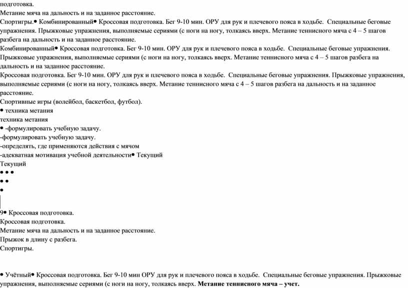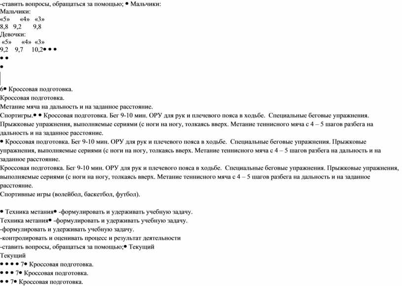 Кроссовая подготовка. Бег 6-7 мин. ОРУ для рук и плечевого пояса в ходьбе. Специальные беговые упражнения. Прыжковые упражнения, выполняемые сериями (с ноги на ногу, толкаясь вверх. Метание теннисного мяча с 4 – 5 шагов разбега на дальность и на заданное расстояние. Спортигры (волейбол, баскетбол, футбол).
