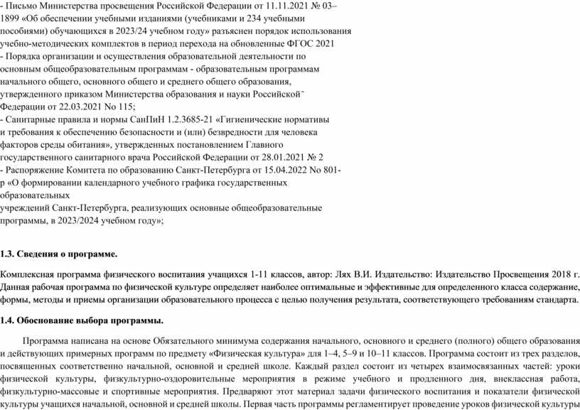 Комплексная программа физического воспитания учащихся 1-11 классов, автор: Лях В.И. Издательство: Издательство Просвещения 2018 г. Данная рабочая программа по физической культуре определяет наиболее оптимальные и эффективные для определенного класса содержание, формы, методы и приемы организации образовательного процесса с целью получения результата, соответствующего требованиям стандарта.