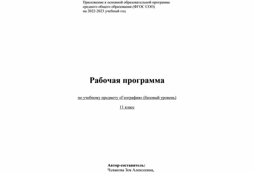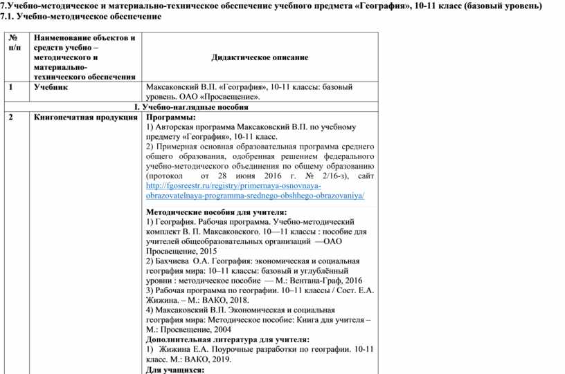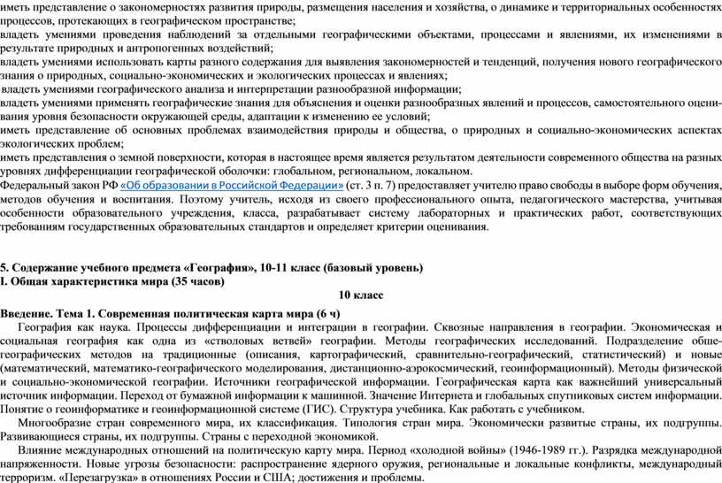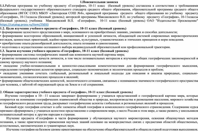 1.1.Рабочая программа по учебному предмету «География», 10-11 класс (базовый уровень) составлена в соответствии с требованиями федерального государственного образовательного стандарта среднего общего образования, образовательной программы среднего общего образования (ФГОС СОО) МБОУ «Лянторская СОШ №4», примерной программы среднего общего образования по учебному предмету «География», 10-11классы (базовый уровень); авторской программы Максаковского В.П. по учебному предмету «География», 10-11классы (базовый уровень); учебника Максаковский В.П. «География», 10-11 класс (базовый уровень) ОАО "Издательство Просвещение" https://catalog.prosv.ru/item/25033