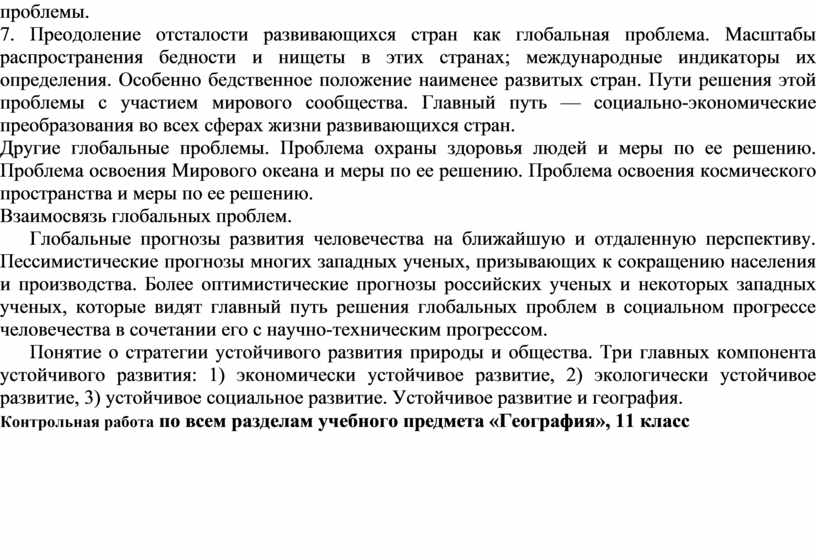 Изучение географии в 10—11 классах завершает формирование у учащихся представлений о географической картине мира, которые опираются на понимание географических взаимосвязей общества и природы, воспроизводства и размещения населения, мирового хозяйства и географического разделения труда, раскрывает географические аспекты глобальных и региональных явлений и процессов.