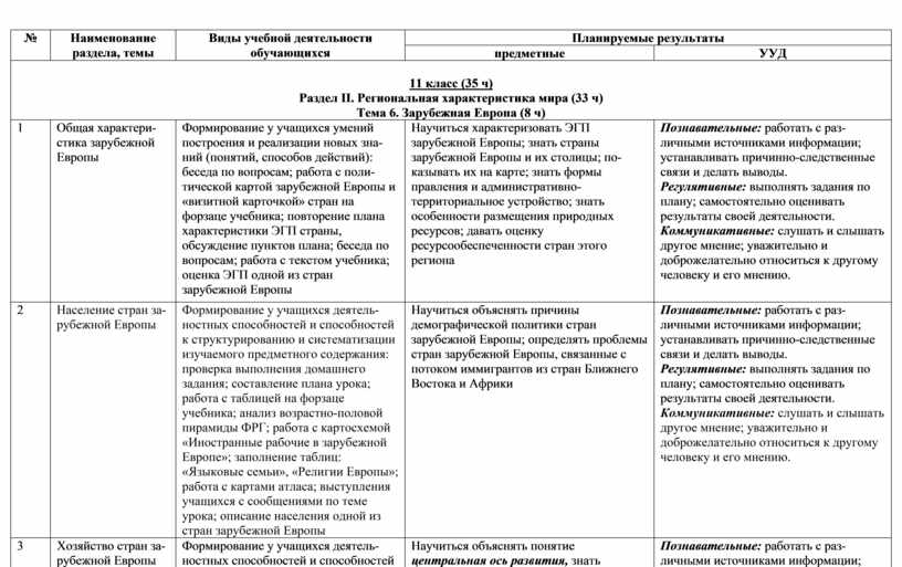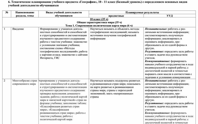 Тематическое планирование учебного предмета «География», 10-11 класс (базовый уровень) с определением основных видов учебной деятельности обучающихся ……. |