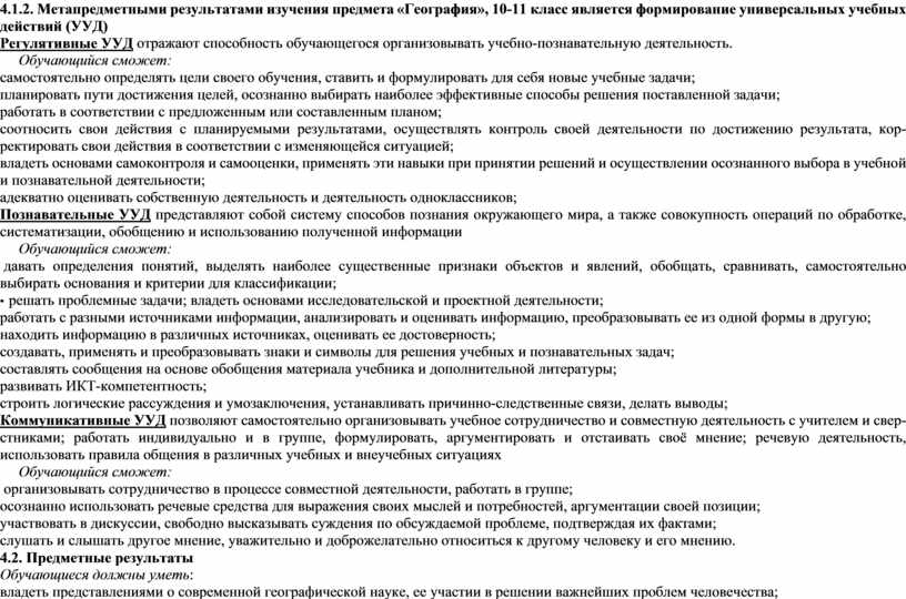 4.1.2. Метапредметными результатами изучения предмета «География», 10-11 класс является формирование универсальных учебных действий (УУД)