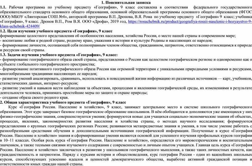 1.1. Рабочая программа по учебному предмету «География», 9 класс составлена в соответствии федерального государственного образовательного стандарта основного общего образования, основной образовательной программы основного общего образования (ФГОС ООО) МБОУ «Лянторская СОШ №4», авторской программы В.П. Дронова, В.Я. Рома по учебному предмету «География» 9 класс; учебника «География», 9 класс. Дронов В.П., Ром В.Я. ООО «Дрофа», 2019 год, https://rosuchebnik.ru/product/geografiya-rossii-naselenie-i-hozyaystvo-9-klass-uchebnik-424409/