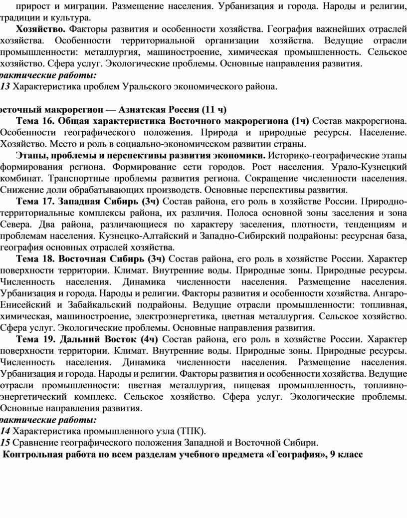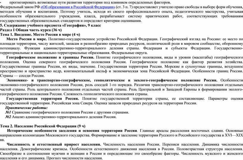 Курс «География России. Население и хозяйство», 9 класс, занимает центральное место в системе школьного географического образования. Этот курс завершает базовое географическое образование школьников. В нём обобщаются и дополняются уже имеющиеся у них физико-географические знания, совершенствуются умения; формируются новые для учащихся социально-экономические знания об объектах, процессах, явлениях, закономерностях развития населения и хозяйства страны, о методах научного исследования; формируются представления о крупных географических регионах России; развиваются метапредметные знания и умения, в том числе умение работать с разнообразными средствами обучения и дополнительными источниками географической информации. Полученные в курсе «География России. Население и хозяйство» знания и сформированные умения являются основой для успешного изучения профильных курсов географии в 10–11 классах. Особая роль курса «География России. Население и хозяйство», определяется его мировоззренческим и воспитательным значением, а также тесными связями изучаемого содержания с современностью и личным опытом учащихся. Главная цель курса «География России. Население и хозяйство» заключается в развитии у школьников географического мышления, а также таких личностных качеств, как гражданственность и патриотизм. Наряду с курсами истории и обществоведения, курс географии России - один из важнейших школьных курсов, способствующих усвоению идеалов и ценностей демократического общества, выработке активной гражданской позиции и ответственности юных граждан нашей страны.