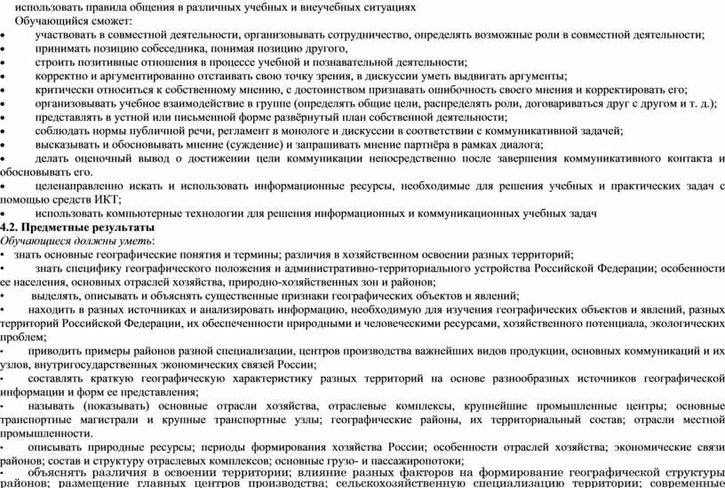4. Требования к результатам обучения и освоения содержания учебного предмета «География», 9 класс