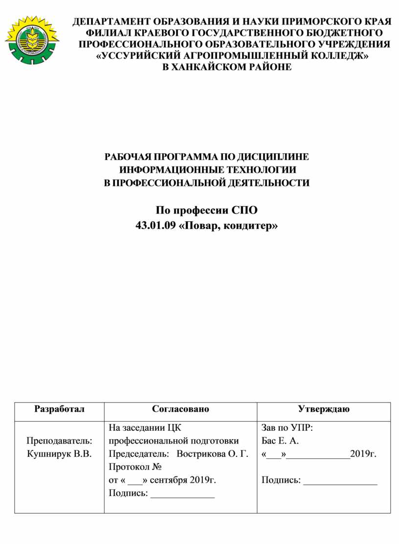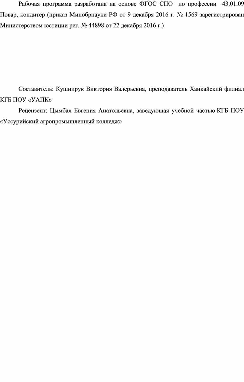 Рабочая программа разработана на основе ФГОС СПО по профессии 43.01.09 Повар, кондитер (приказ Минобрнауки РФ от 9 декабря 2016 г. № 1569 зарегистрирован Министерством юстиции рег. № 44898 от 22 декабря 2016 г.)
