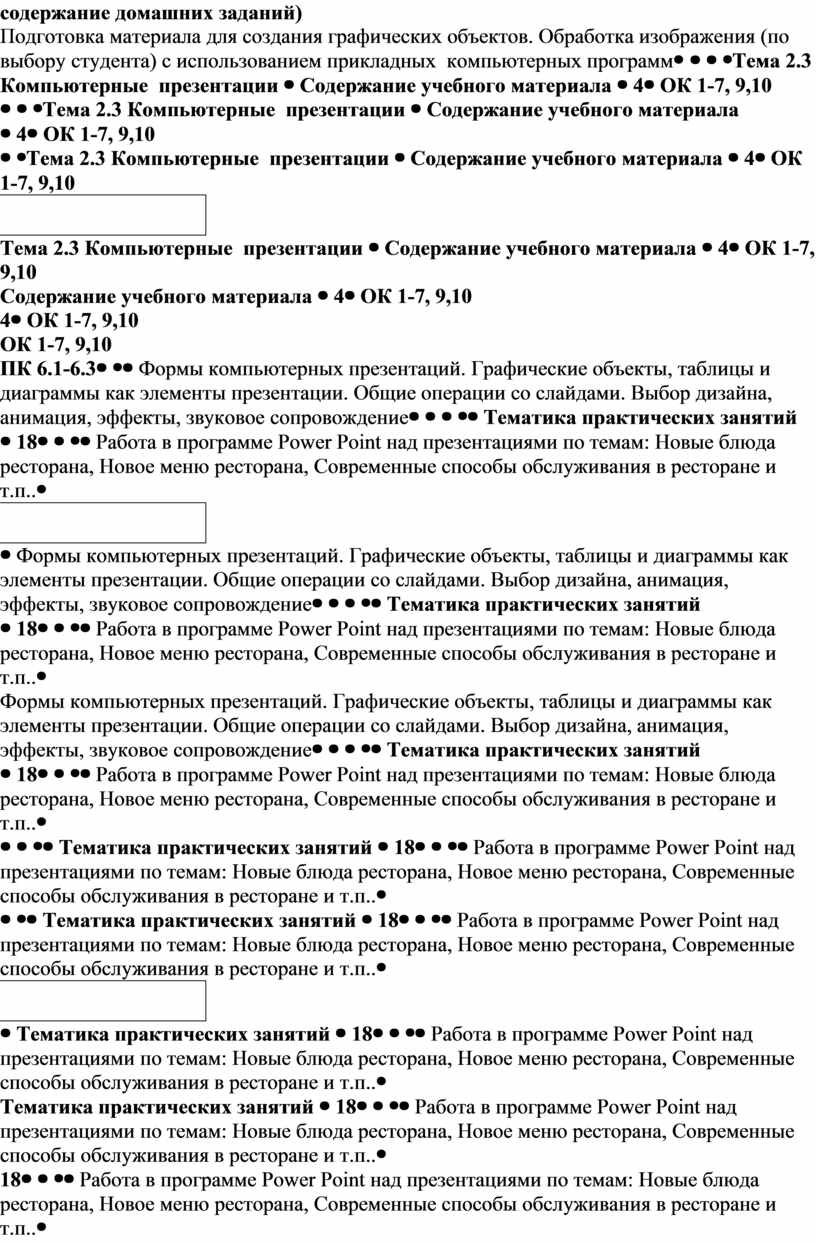 Самостоятельная работа обучающихся (при наличии указывается тематика и содержание домашних заданий) Работа в поисковых системах сети Интернет, сбор материала и подготовка презентации по теме «Современные тенденции в оформлении блюд». |