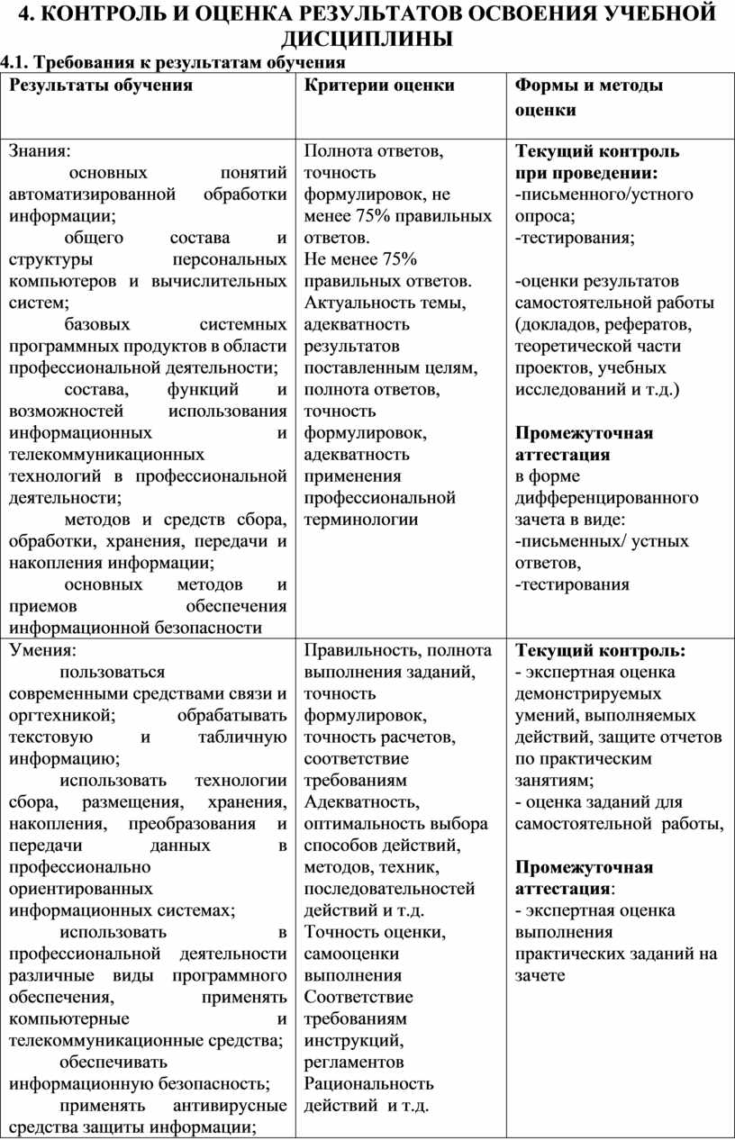 4. КОНТРОЛЬ И ОЦЕНКА РЕЗУЛЬТАТОВ ОСВОЕНИЯ УЧЕБНОЙ ДИСЦИПЛИНЫ