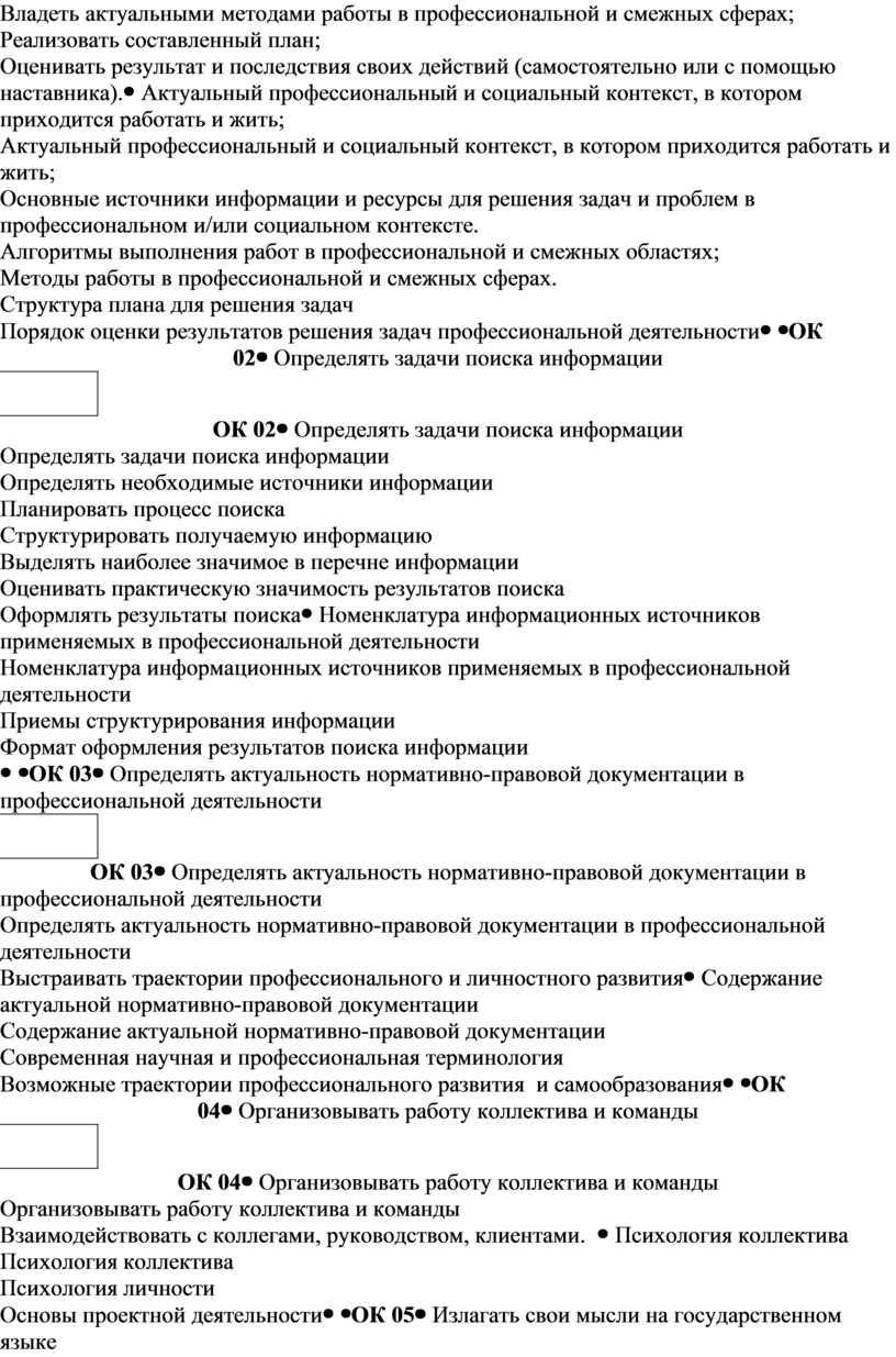 Актуальный профессиональный и социальный контекст, в котором приходится работать и жить; Основные источники информации и ресурсы для решения задач и проблем в профессиональном и/или социальном контексте. Алгоритмы выполнения работ в профессиональной и смежных областях; Методы работы в профессиональной и смежных сферах. Структура плана для решения задач Порядок оценки результатов решения задач профессиональной деятельности |