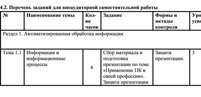 4.2. Перечень заданий для внеаудиторной самостоятельной работы