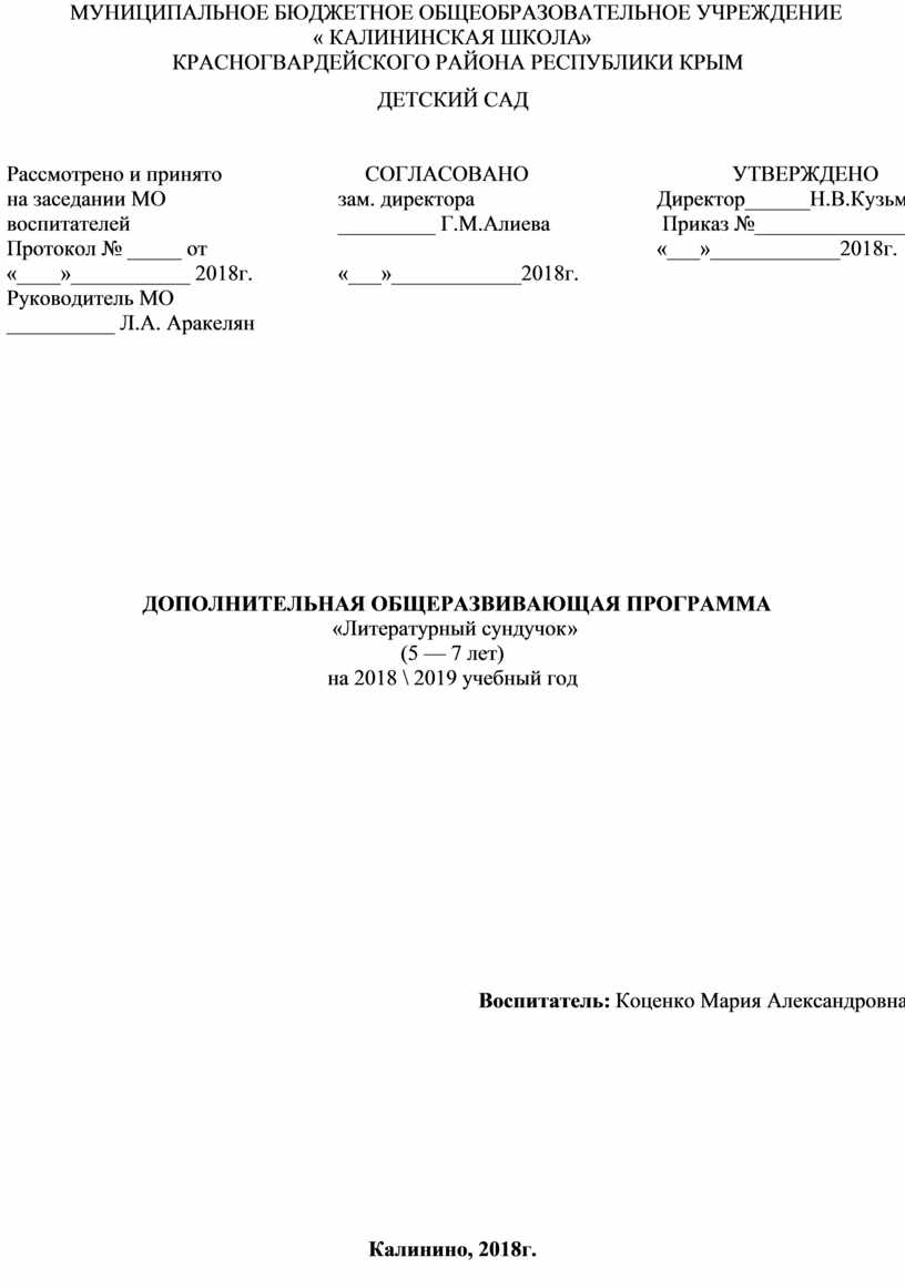 Рассмотрено и принято на заседании МО воспитателей Протокол № _____ от «____»___________ 2018г. Руководитель МО __________ Л.А. Аракелян |