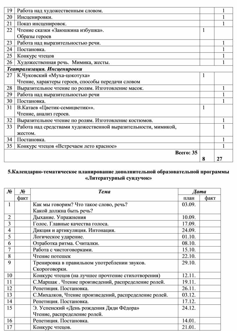 5.Календарно-тематическое планирование дополнительной образовательной программы «Литературный сундучок»