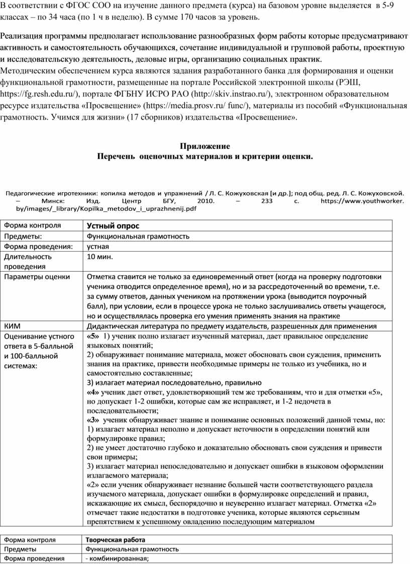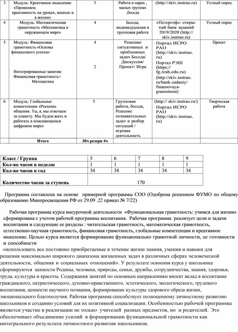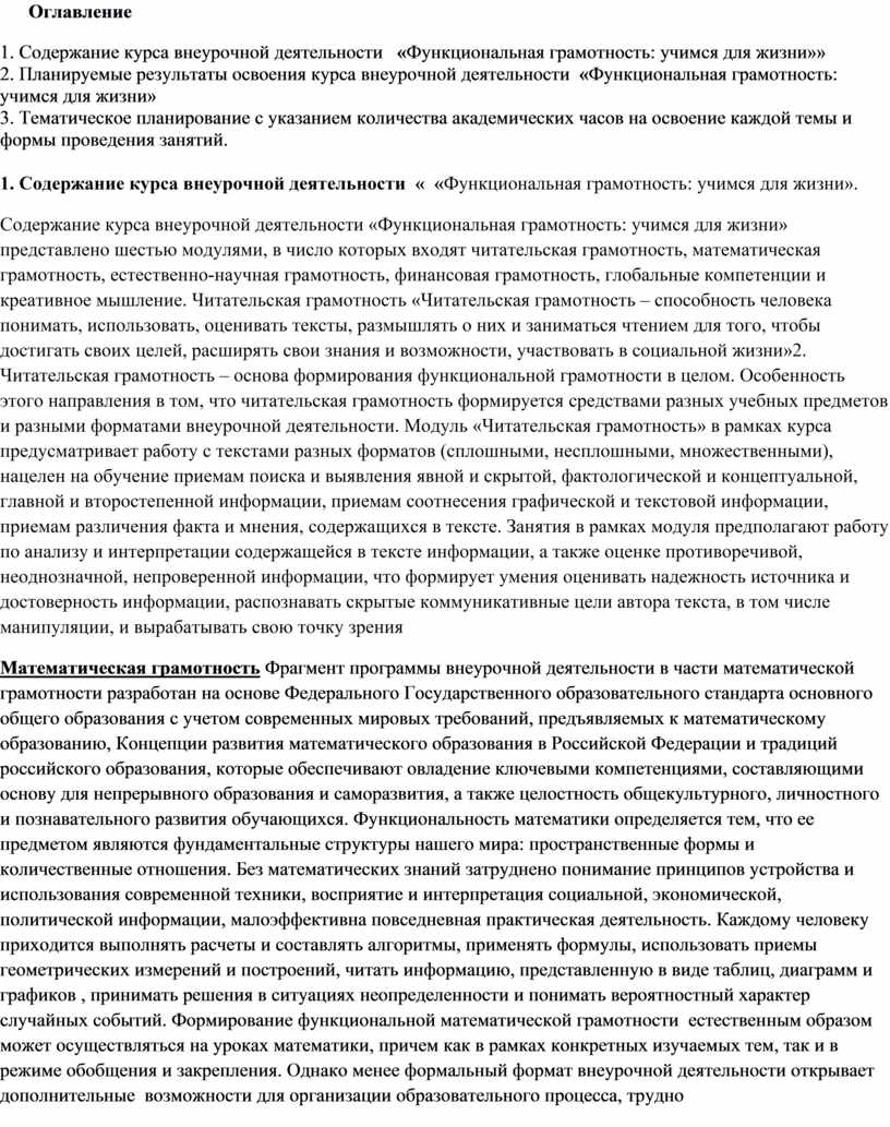 Рабочая программа курса внеурочной деятельности «Функциональная грамотность: учимся для жизни» сформирована с учетом рабочей программы воспитания. Рабочая программа реализует цели и задачи воспитания и следующие ее разделы : читательская грамотность, математическая грамотность, естественно-научная грамотность, финансовая грамотность, глобальные компетенции и креативное мышление. Целью курса является формирование функционально грамотной личности, ее готовности и способности
