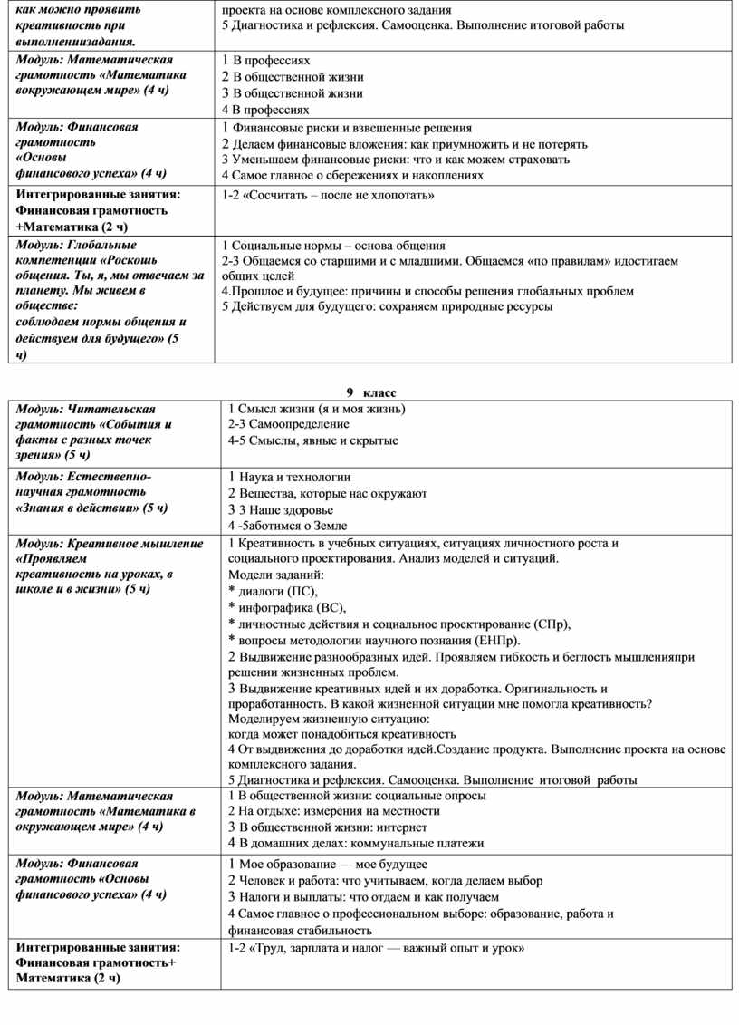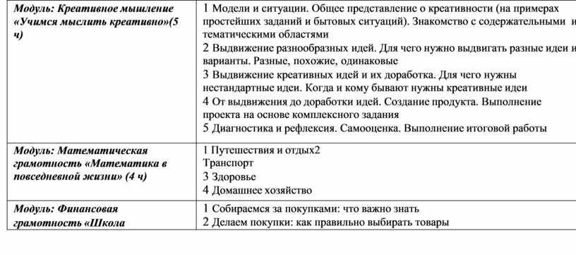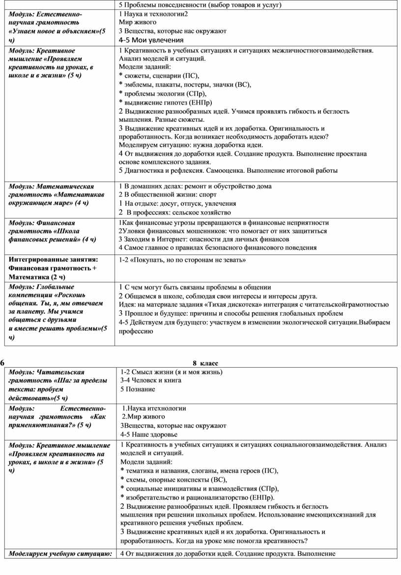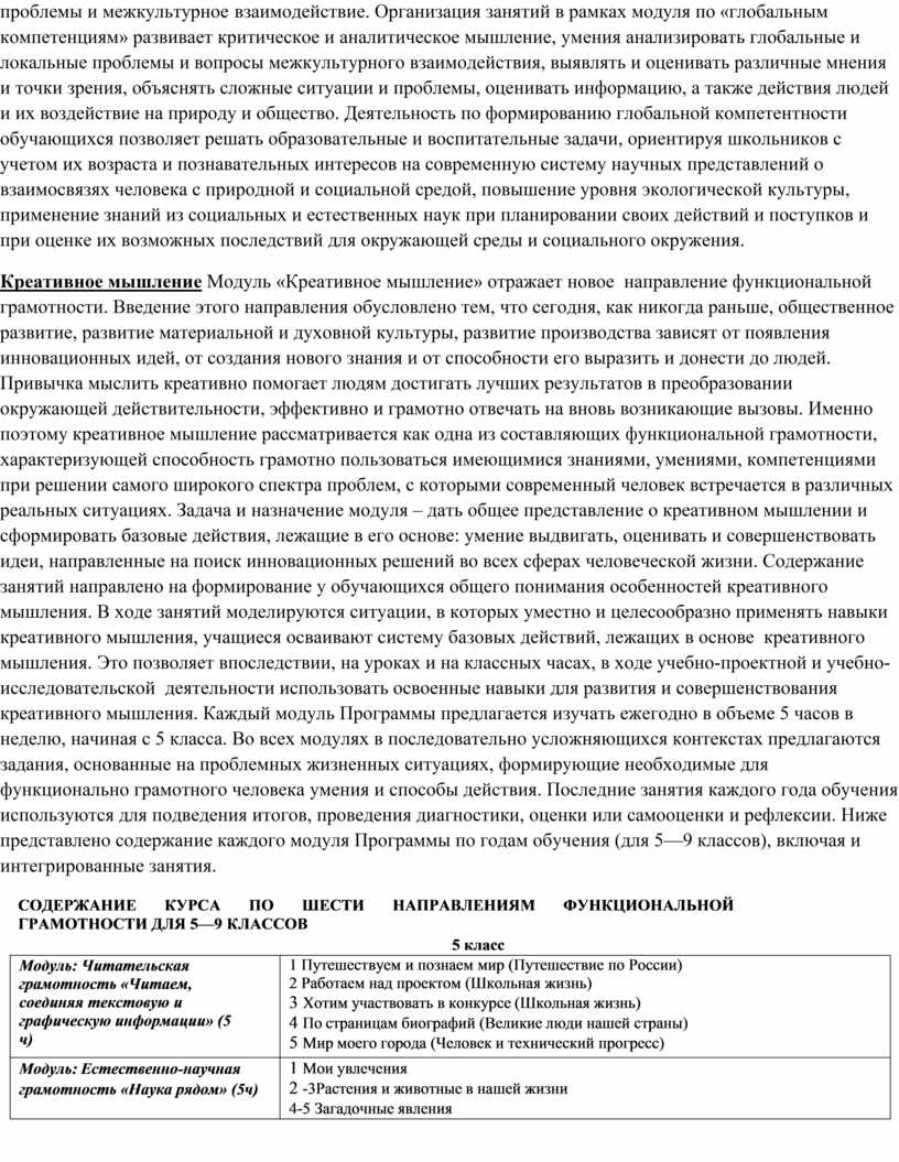 Креативное мышление Модуль «Креативное мышление» отражает новое направление функциональной грамотности. Введение этого направления обусловлено тем, что сегодня, как никогда раньше, общественное развитие, развитие материальной и духовной культуры, развитие производства зависят от появления инновационных идей, от создания нового знания и от способности его выразить и донести до людей. Привычка мыслить креативно помогает людям достигать лучших результатов в преобразовании окружающей действительности, эффективно и грамотно отвечать на вновь возникающие вызовы. Именно поэтому креативное мышление рассматривается как одна из составляющих функциональной грамотности, характеризующей способность грамотно пользоваться имеющимися знаниями, умениями, компетенциями при решении самого широкого спектра проблем, с которыми современный человек встречается в различных реальных ситуациях. Задача и назначение модуля – дать общее представление о креативном мышлении и сформировать базовые действия, лежащие в его основе: умение выдвигать, оценивать и совершенствовать идеи, направленные на поиск инновационных решений во всех сферах человеческой жизни. Содержание занятий направлено на формирование у обучающихся общего понимания особенностей креативного мышления. В ходе занятий моделируются ситуации, в которых уместно и целесообразно применять навыки креативного мышления, учащиеся осваивают систему базовых действий, лежащих в основе креативного мышления. Это позволяет впоследствии, на уроках и на классных часах, в ходе учебно-проектной и учебно-исследовательской деятельности использовать освоенные навыки для развития и совершенствования креативного мышления. Каждый модуль Программы предлагается изучать ежегодно в объеме 5 часов в неделю, начиная с 5 класса. Во всех модулях в последовательно усложняющихся контекстах предлагаются задания, основанные на проблемных жизненных ситуациях, формирующие необходимые для функционально грамотного человека умения и способы действия. Последние занятия каждого года обучения используются для подведения итогов, проведения диагностики, оценки или самооценки и рефлексии. Ниже представлено содержание каждого модуля Программы по годам обучения (для 5—9 классов), включая и интегрированные занятия.