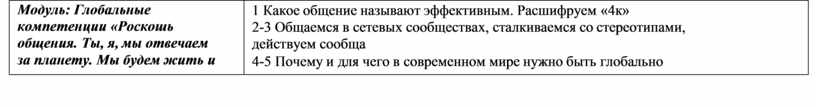 Модуль: Глобальные компетенции «Роскошь общения. Ты, я, мы отвечаем за планету. Мы учимся взаимодействовать и знакомимся с глобальными проблемами» (5 ч) |