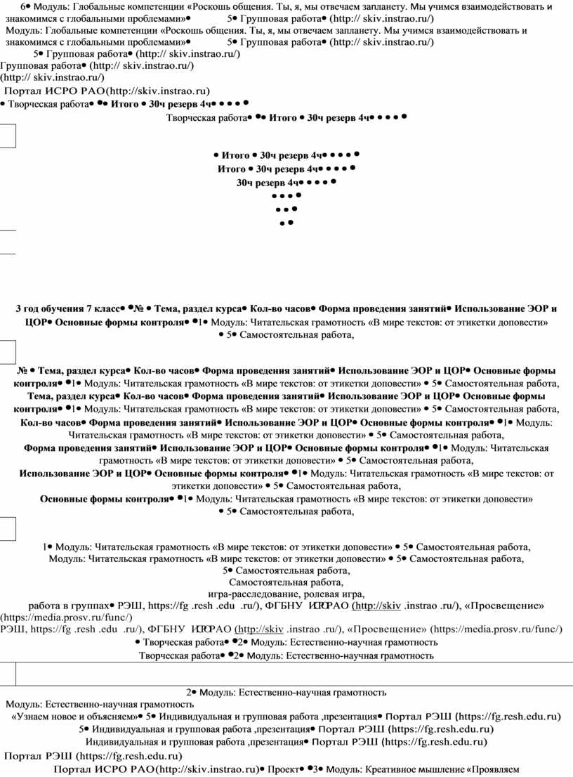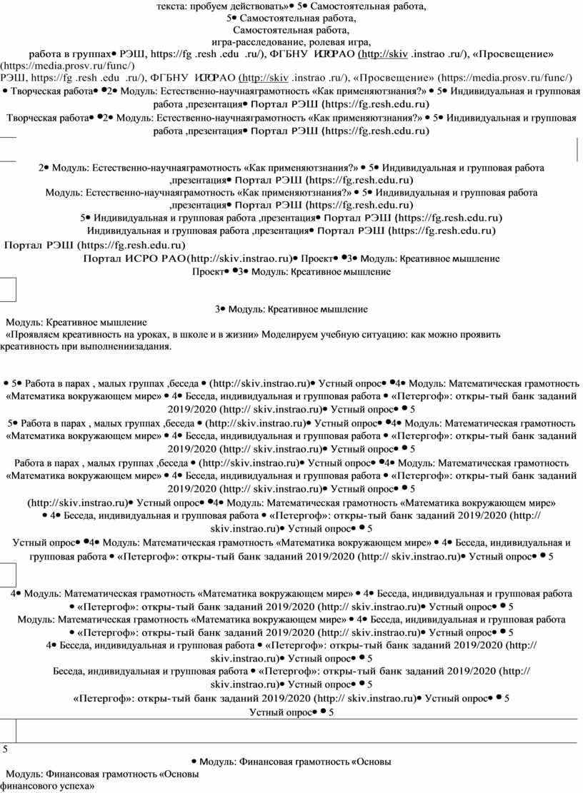Содержание курса внеурочной деятельности «Функциональная грамотность: учимся для жизни» представлено шестью модулями, в число которых входят читательская грамотность, математическая грамотность, естественно-научная грамотность, финансовая грамотность, глобальные компетенции и креативное мышление. Читательская грамотность «Читательская грамотность – способность человека понимать, использовать, оценивать тексты, размышлять о них и заниматься чтением для того, чтобы достигать своих целей, расширять свои знания и возможности, участвовать в социальной жизни»2. Читательская грамотность – основа формирования функциональной грамотности в целом. Особенность этого направления в том, что читательская грамотность формируется средствами разных учебных предметов и разными форматами внеурочной деятельности. Модуль «Читательская грамотность» в рамках курса предусматривает работу с текстами разных форматов (сплошными, несплошными, множественными), нацелен на обучение приемам поиска и выявления явной и скрытой, фактологической и концептуальной, главной и второстепенной информации, приемам соотнесения графической и текстовой информации, приемам различения факта и мнения, содержащихся в тексте. Занятия в рамках модуля предполагают работу по анализу и интерпретации содержащейся в тексте информации, а также оценке противоречивой, неоднозначной, непроверенной информации, что формирует умения оценивать надежность источника и достоверность информации, распознавать скрытые коммуникативные цели автора текста, в том числе манипуляции, и вырабатывать свою точку зрения