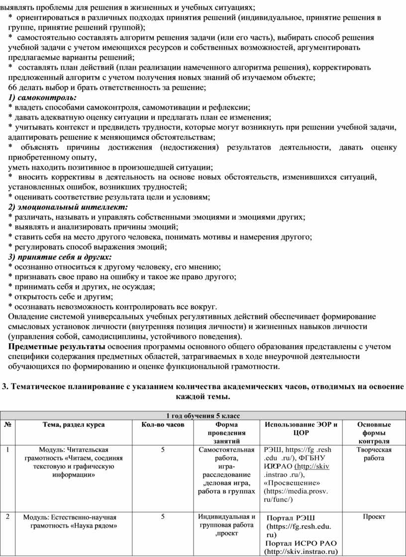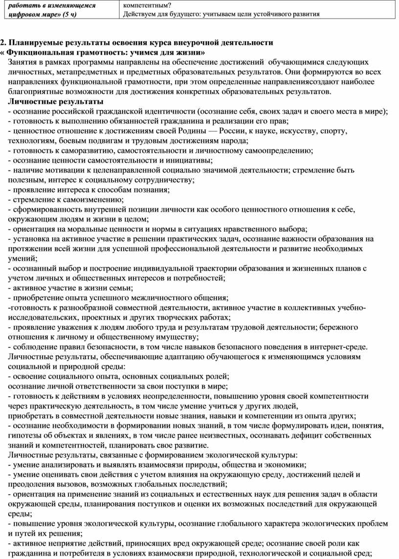 «использовать все постоянно приобретаемые в течение жизни знания, умения и навыки для решения максимально широкого диапазона жизненных задач в различных сферах человеческой деятельности, общения и социальных отношений». У результате освоения курса у школьника сформируются ценности Родины, человека, природы, семьи, дружбы, сотрудничества, знания, здоровья, труда, культуры и красоты. Содержания занятий по основным направлениям вносят вклад в воспитание гражданского, патриотического, духовно-нравственного, эстетического, экологического, трудового воспитания, ценности научного познания, формирование культуры здорового образа жизни, эмоционального благополучия. Рабочая программа способствует полноценному личностному развитию школьников и созданию условий для их позитивной социализации. Особенностью рабочей программы является участие в реализации не только учителей разных предметов, но и родителей. Это обеспечивает объединение усилий в формировании функциональной грамотности как интегрального результата личностного развития школьников.
