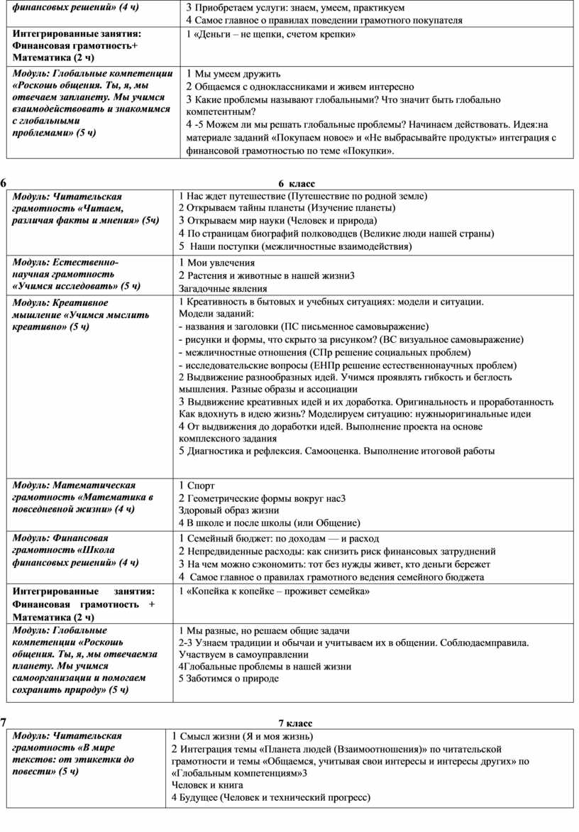 Финансовая грамотность Формирование финансовой грамотности предполагает освоение знаний, умений, установок и моделей поведения, необходимых для принятия разумных финансовых решений. С этой целью в модуль финансовой грамотности Программы включены разделы «Школа финансовых решений» (5—7 классы) и «Основы финансового успеха» (8—9 классы). Изучая темы этих «ФУНКЦИОНАЛЬНАЯ ГРАМОТНОСТЬ: УЧИМСЯ ДЛЯ ЖИЗНИ» 9 разделов, обучающиеся познакомятся с базовыми правилами грамотного использования денежных средств, научатся выявлять и анализировать финансовую информацию, оценивать финансовые проблемы, обосновывать финансовые решения и оценивать финансовые риски. Занятия по программе способствуют выработке умений и навыков, необходимых при рассмотрении финансовых вопросов, не имеющих однозначно правильных решений, требующих анализа альтернатив и возможных последствий сделанного выбора с учетом возможностей и предпочтений конкретного человека или семьи. Содержание занятий создает условия для применения финансовых знаний и понимания при решении практических вопросов, входящих в число задач, рассматриваемых при изучении математики, информатики, географии и обществознания.