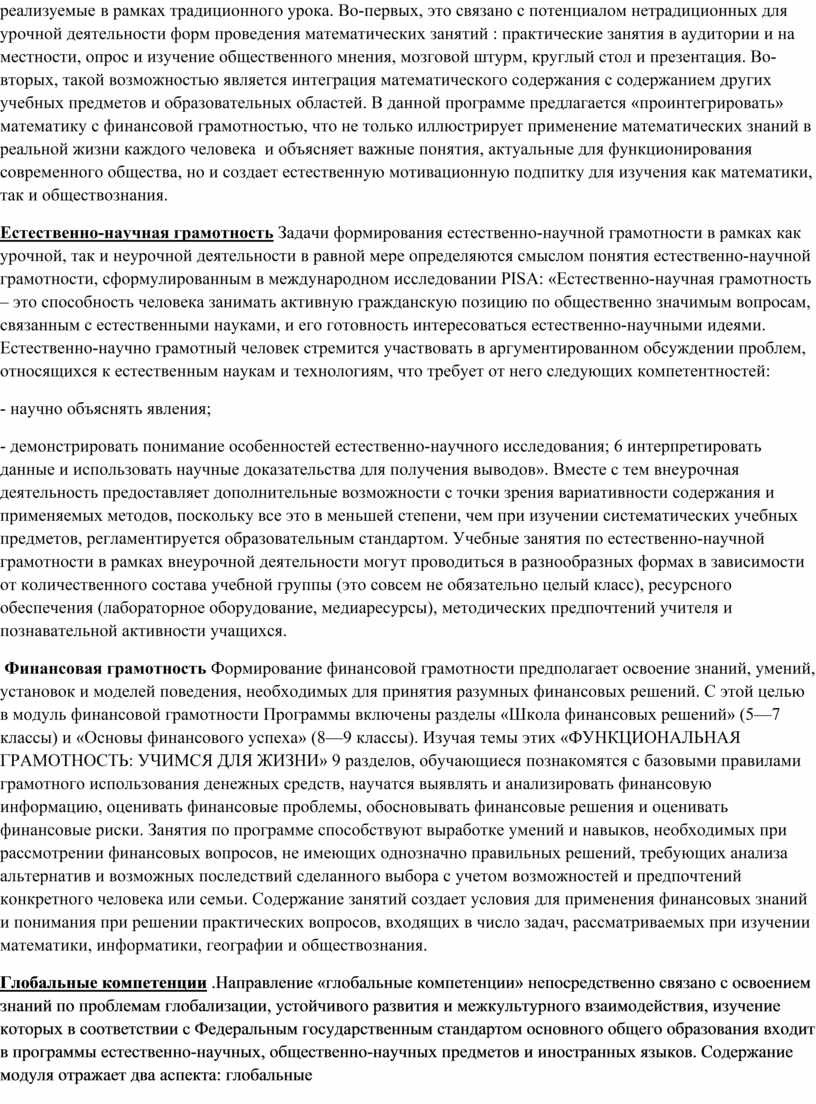 Математическая грамотность Фрагмент программы внеурочной деятельности в части математической грамотности разработан на основе Федерального Государственного образовательного стандарта основного общего образования с учетом современных мировых требований, предъявляемых к математическому образованию, Концепции развития математического образования в Российской Федерации и традиций российского образования, которые обеспечивают овладение ключевыми компетенциями, составляющими основу для непрерывного образования и саморазвития, а также целостность общекультурного, личностного и познавательного развития обучающихся. Функциональность математики определяется тем, что ее предметом являются фундаментальные структуры нашего мира: пространственные формы и количественные отношения. Без математических знаний затруднено понимание принципов устройства и использования современной техники, восприятие и интерпретация социальной, экономической, политической информации, малоэффективна повседневная практическая деятельность. Каждому человеку приходится выполнять расчеты и составлять алгоритмы, применять формулы, использовать приемы геометрических измерений и построений, читать информацию, представленную в виде таблиц, диаграмм и графиков , принимать решения в ситуациях неопределенности и понимать вероятностный характер случайных событий. Формирование функциональной математической грамотности естественным образом может осуществляться на уроках математики, причем как в рамках конкретных изучаемых тем, так и в режиме обобщения и закрепления. Однако менее формальный формат внеурочной деятельности открывает дополнительные возможности для организации образовательного процесса, трудно реализуемые в рамках традиционного урока. Во-первых, это связано с потенциалом нетрадиционных для урочной деятельности форм проведения математических занятий : практические занятия в аудитории и на местности, опрос и изучение общественного мнения, мозговой штурм, круглый стол и презентация. Во-вторых, такой возможностью является интеграция математического содержания с содержанием других учебных предметов и образовательных областей. В данной программе предлагается «проинтегрировать» математику с финансовой грамотностью, что не только иллюстрирует применение математических знаний в реальной жизни каждого человека и объясняет важные понятия, актуальные для функционирования современного общества, но и создает естественную мотивационную подпитку для изучения как математики, так и обществознания.