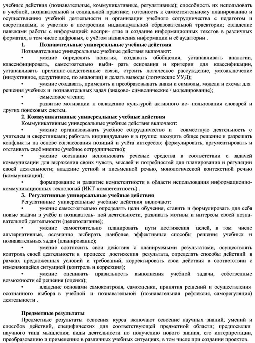 учебные действия (познавательные, коммуникативные, регулятивные); способность их использовать в учебной, познавательной и социальной практике; готовность к самостоятельному планированию и осуществлению учебной деятельности и организации учебного сотрудничества с педагогом и сверстниками, к участию в построении индивидуальной образовательной траектории; овладение навыками работы с информацией: воспри- ятие и создание информационных текстов в различных форматах, в том числе цифровых, с учётом назначения информации и её аудитории .
