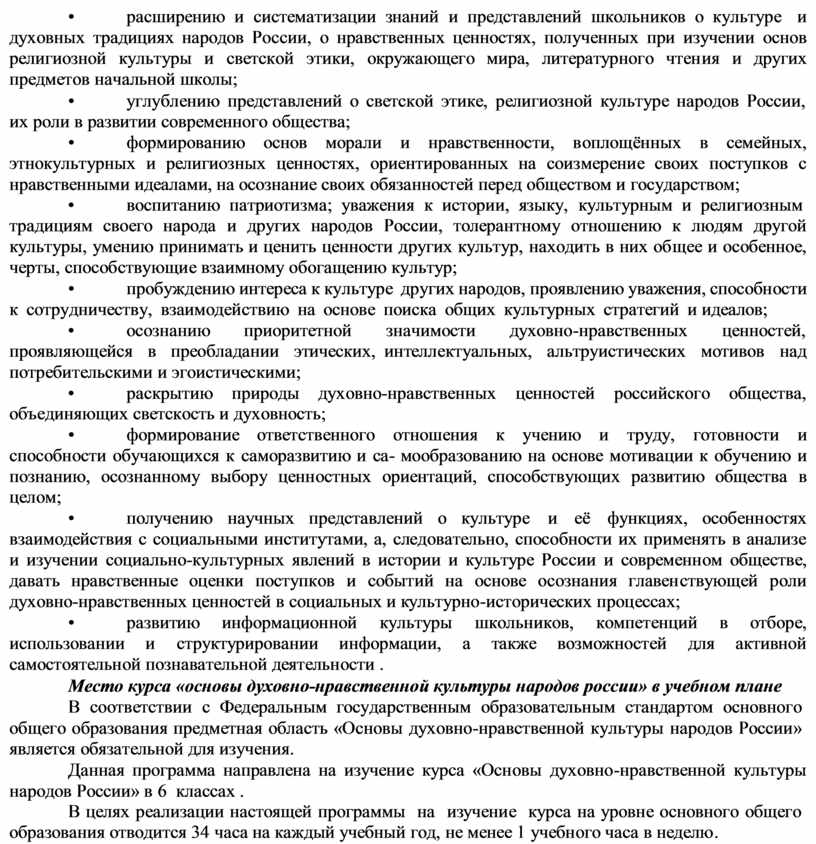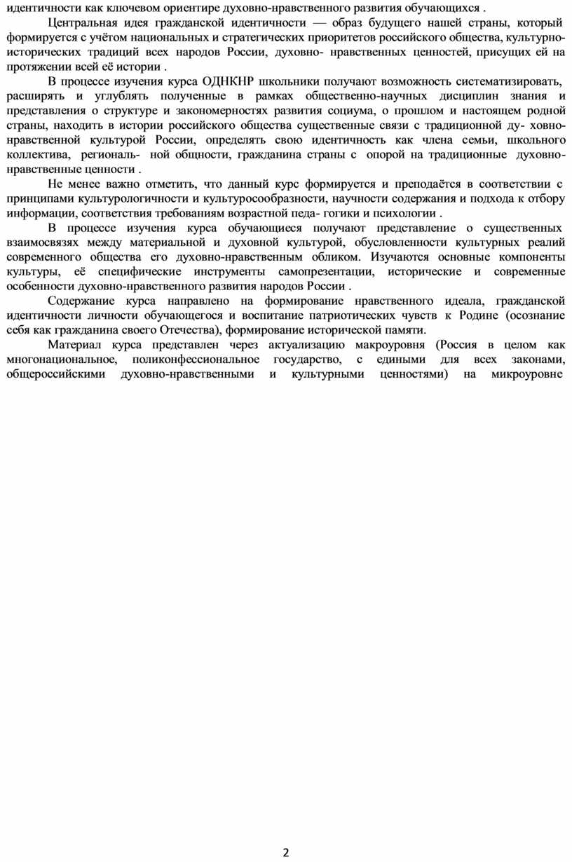 В программе по данному курсу соблюдается преемственность с Федеральным государственным образовательным стандартом начального общего образования, а также учитываются возрастные и психологические особенности обучающихся на ступени основного общего образования, необходимость формирования межпредметных связей. Также в программе учитывается, что данная дисциплина носит культурологический и воспитательный характер, что позволяет утверждать, что именно духовно- нравственное развитие обучающихся в духе общероссийской гражданской идентичности на основе традиционных российских духовно- нравственных ценностей — важнейший результат обучения ОДНКНР .