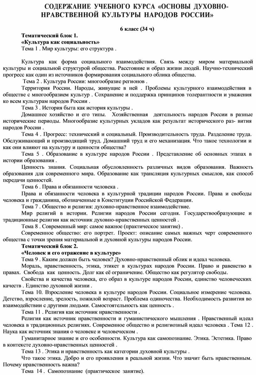взаимосвязях между материальной и духовной культурой, обусловленности культурных реалий современного общества его духовно-нравственным обликом. Изучаются основные компоненты культуры, её специфические инструменты самопрезентации, исторические и современные особенности духовно-нравственного развития народов России .