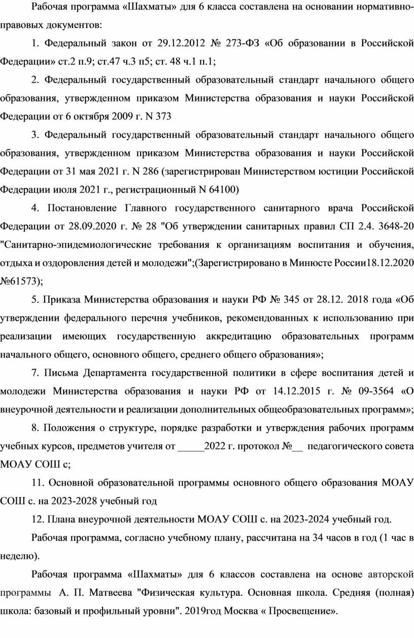 Рабочая программа «Шахматы» для 6 класса составлена на основании нормативно-правовых документов: