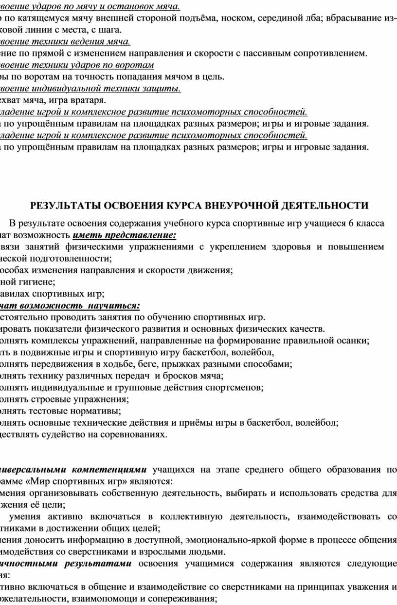 Универсальными компетенциями учащихся на этапе среднего общего образования по программе «Мир спортивных игр» являются: