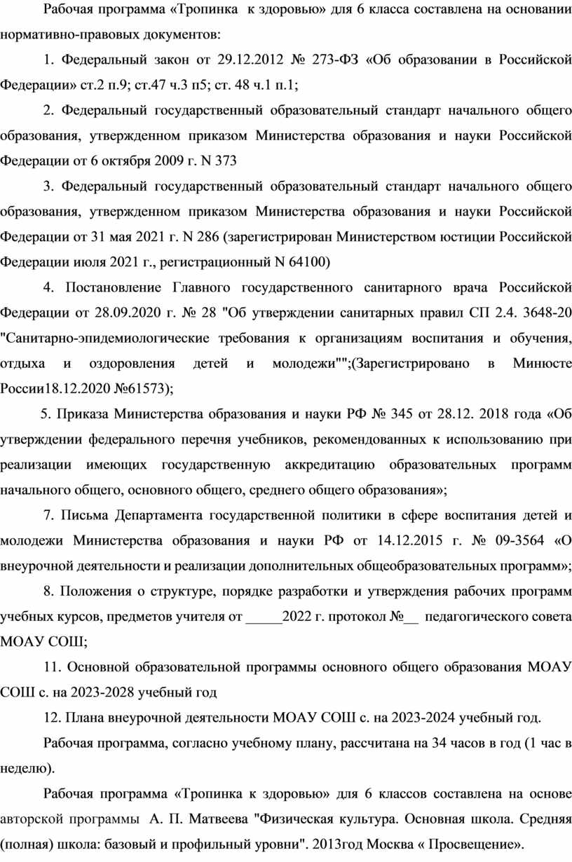 Рабочая программа «Тропинка к здоровью» для 6 класса составлена на основании нормативно-правовых документов:
