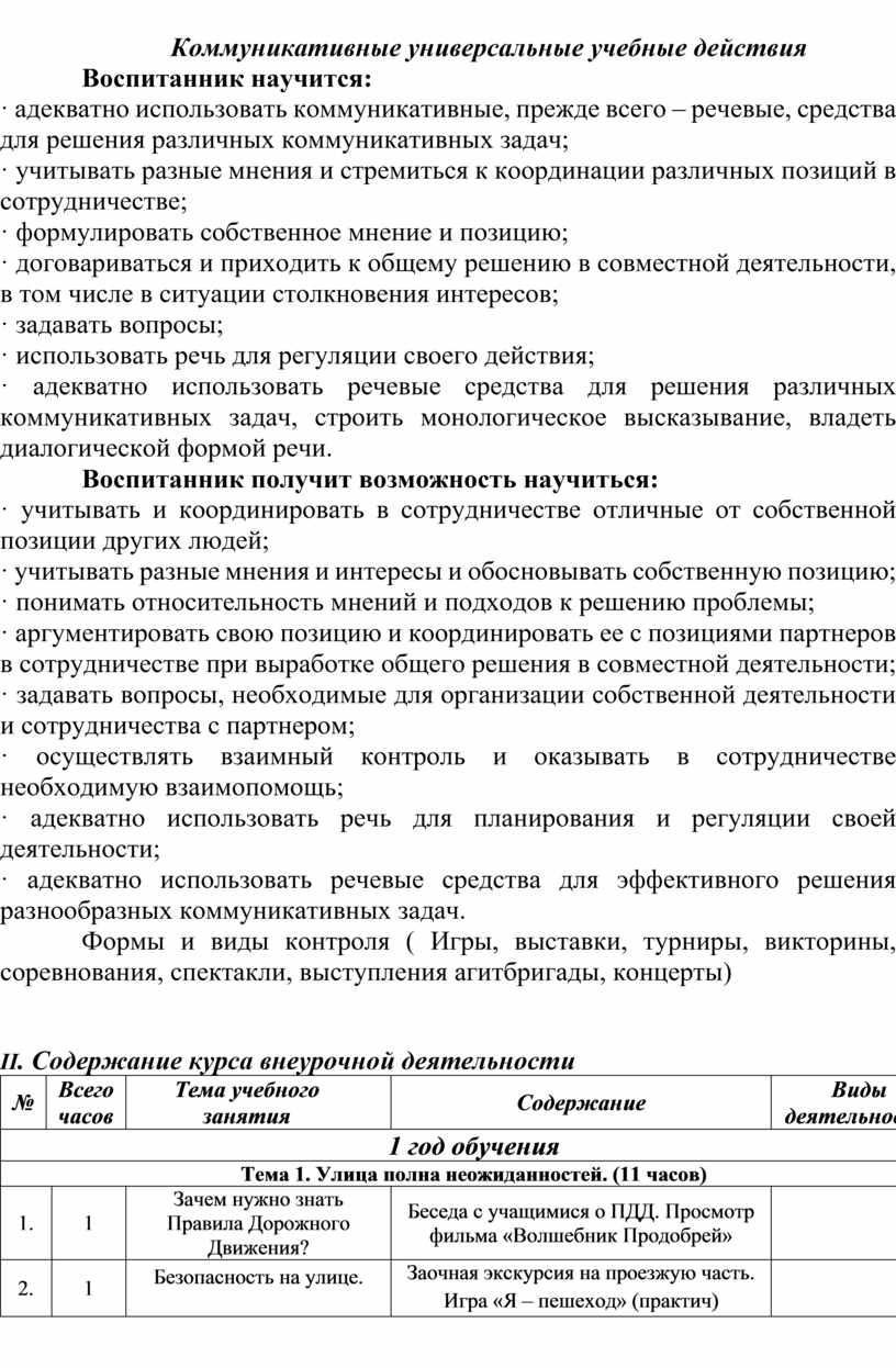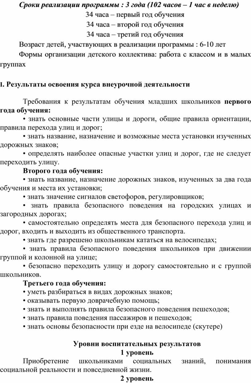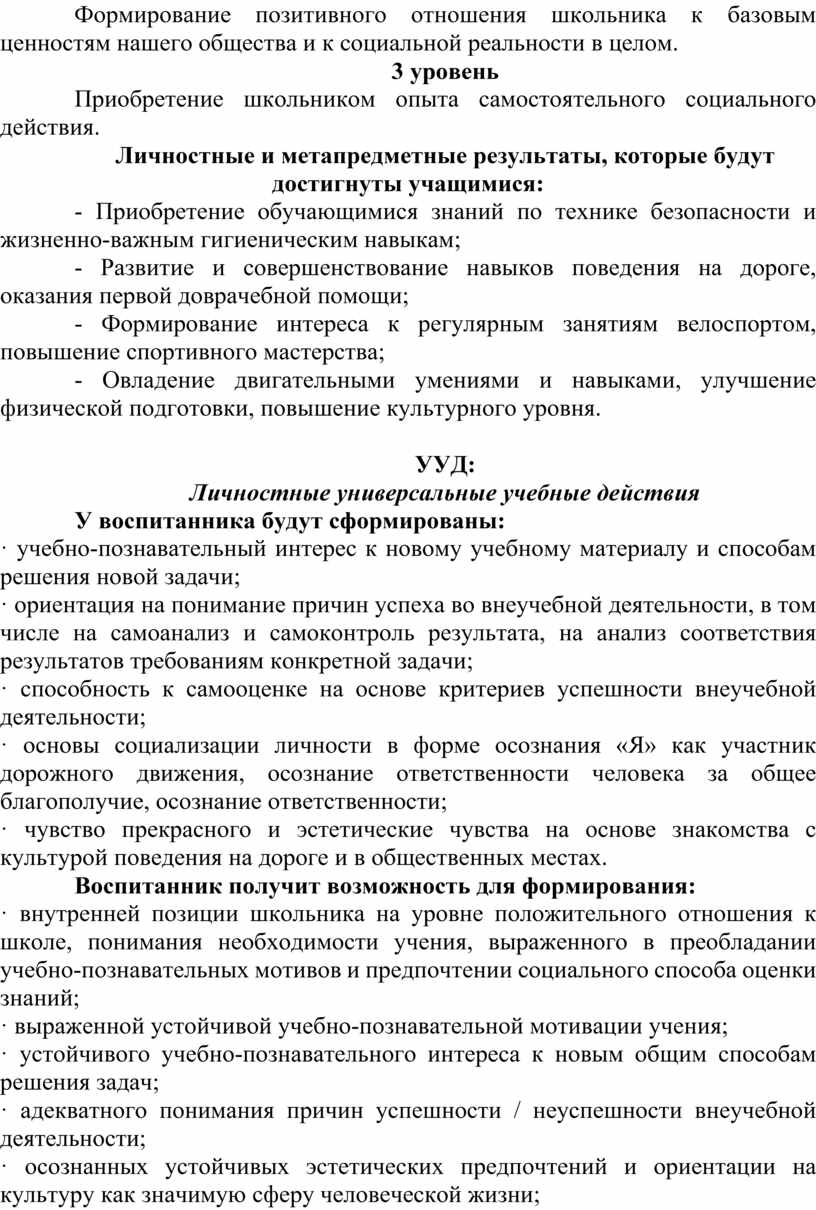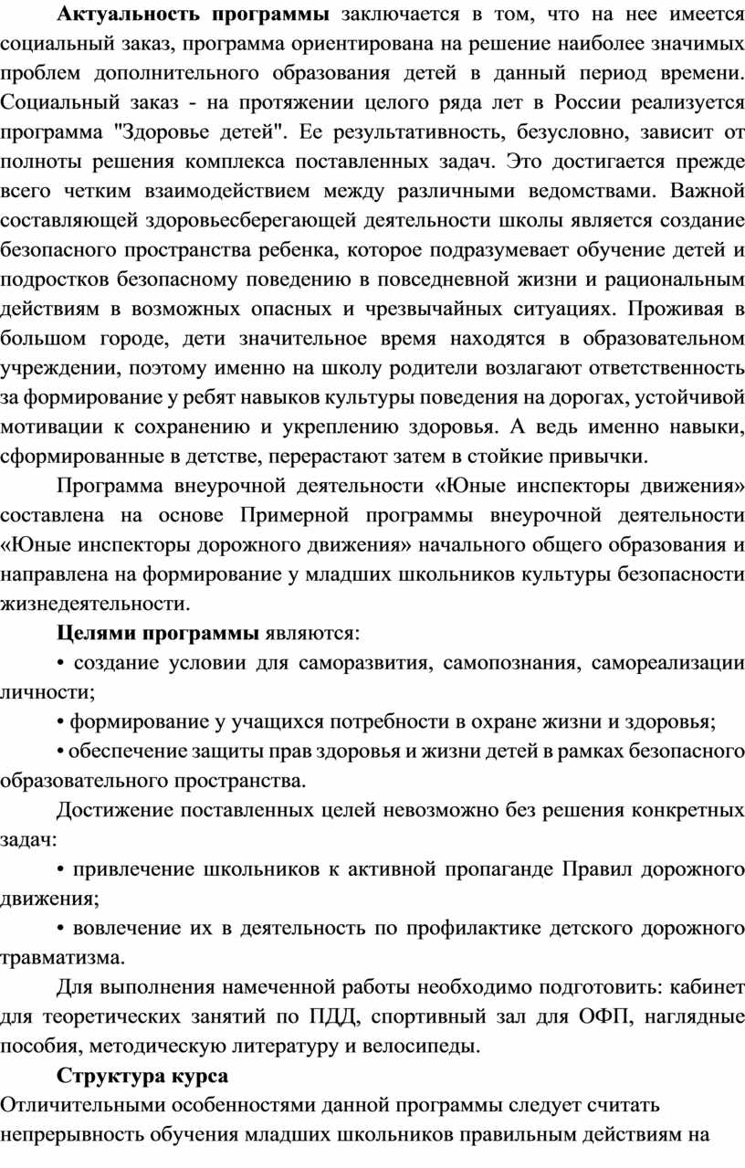 Внеурочная деятельность направлена на формирование у обучающихся основных знаний, умений и навыков безопасного поведения на дорогах. Дети обучаются ПДД, поведению на улице, оказанию первой медицинской помощи, получают навыки фигурного вождения велосипеда. Таким образом, дети овладевают знаниями, непосредственно относящимися к охране жизни и здоровья; привлекаются к участию в пропаганде ПДД среди детей и подростков.