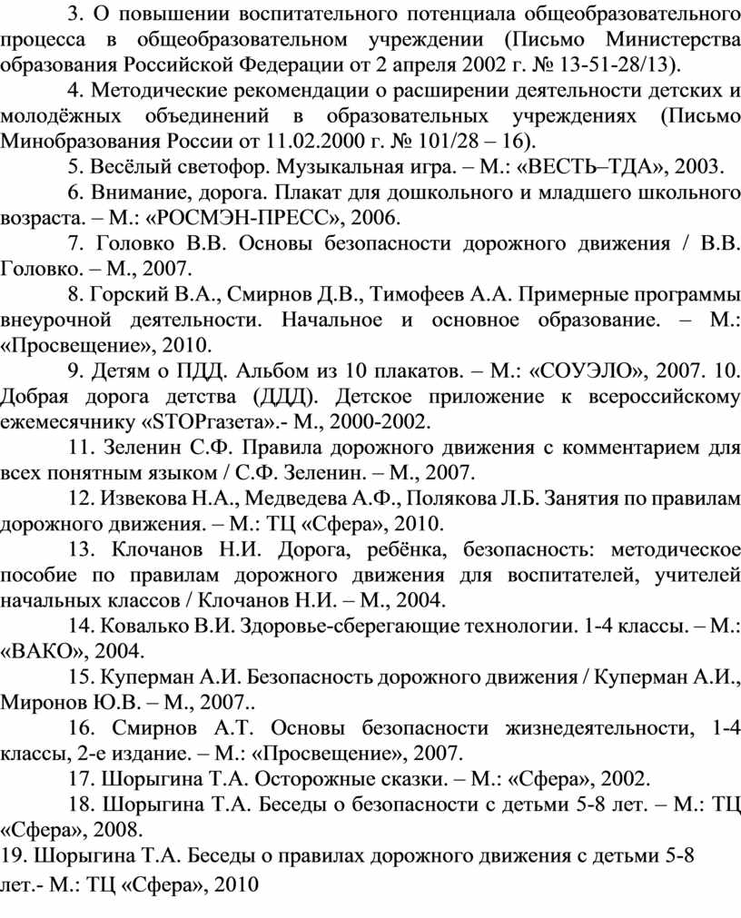 13. Клочанов Н.И. Дорога, ребёнка, безопасность: методическое пособие по правилам дорожного движения для воспитателей, учителей начальных классов / Клочанов Н.И. – М., 2004.
