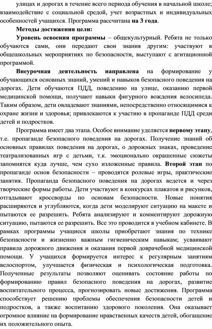 Программа имеет два этапа. Особое внимание уделяется первому этапу, т.е. пропаганде безопасного поведения на дорогах. Получение знаний об основных правилах поведения на дорогах, о дорожных знаках, проведение театрализованных игр с детьми, т.к. эмоционально окрашенные сюжеты запомнятся куда лучше, чем сухо изложенные правила. Второй этап по пропаганде основ безопасности – проводятся ролевые игры, практические занятия. Пропаганда безопасного поведения на дорогах ведется и через творческие формы работы. Дети участвуют в конкурсах плакатов и рисунков, отгадывают кроссворды по основам безопасности. Новые понятия расширяются и углубляются, когда дети моделируют ситуацию на макете и пытаются ее разрешить. Ребята анализируют и комментируют дорожную ситуацию, пытаются ее разрешить. Все это проводится в учебном кабинете. В рамках программы учащиеся школы приобретают знания по технике безопасности и жизненно важным гигиеническим навыкам; усваивают правила дорожного движения и оказания первой доврачебной медицинской помощи. У учащихся формируется интерес к регулярным занятиям велоспортом, улучшается физическая и психологическая подготовка. Полученные результаты позволяют оценивать состояние работы по формированию правил безопасного поведения на дорогах, развитие воспитательного процесса, прогнозировать новые достижения. Программа способствует решению проблемы обеспечения безопасности детей и подростков, а также воспитанию здорового поколения. Она оказывает огромное влияние на формирование нравственных качеств детей, обогащение их положительного опыта.