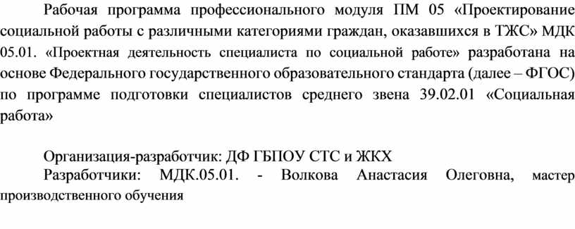 Рабочая программа профессионального модуля ПМ 05 «Проектирование социальной работы с различными категориями граждан, оказавшихся в ТЖС» МДК 05.01. «Проектная деятельность специалиста по социальной работе» разработана на основе Федерального государственного образовательного стандарта (далее – ФГОС) по программе подготовки специалистов среднего звена 39.02.01 «Социальная работа»