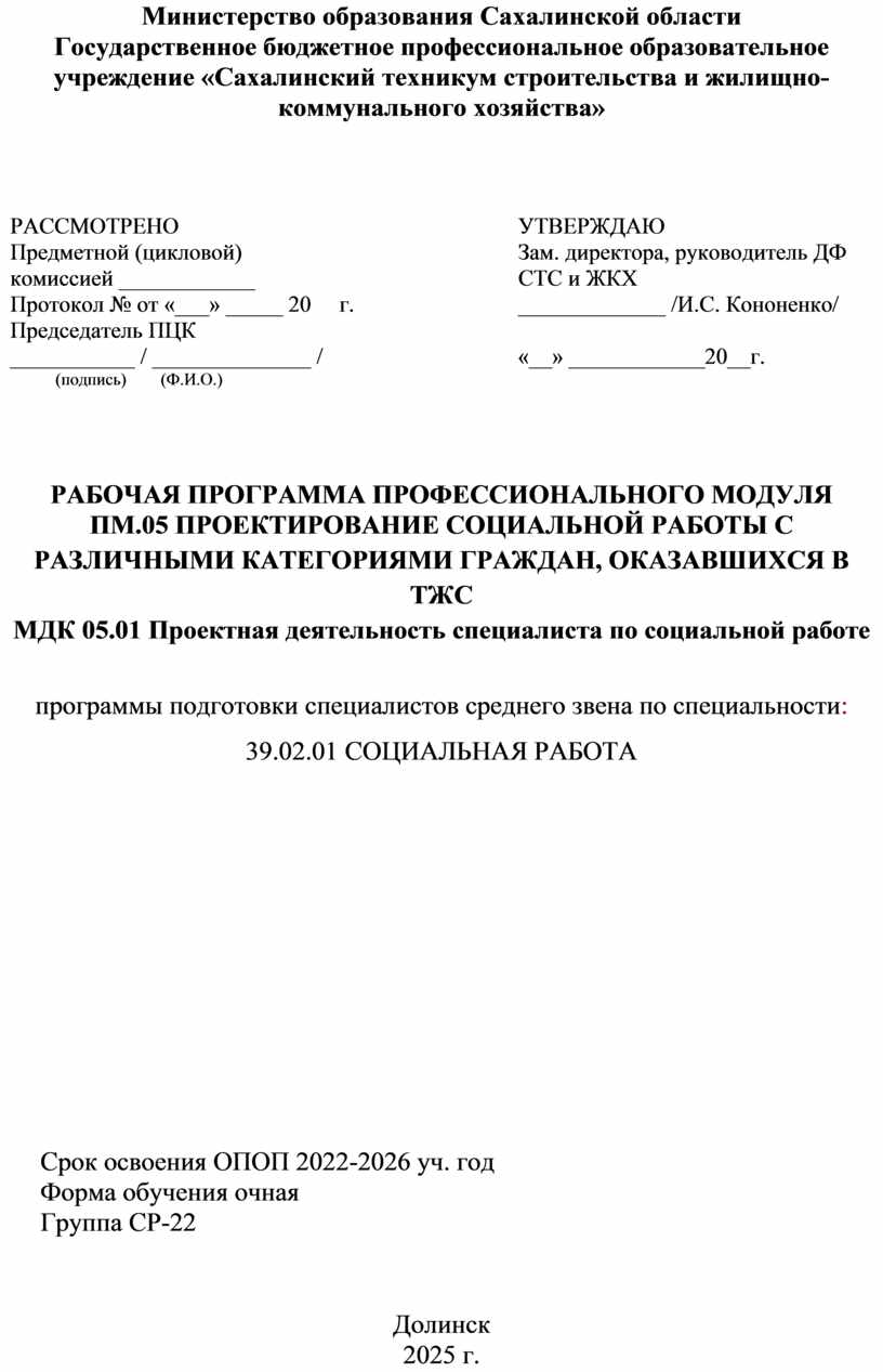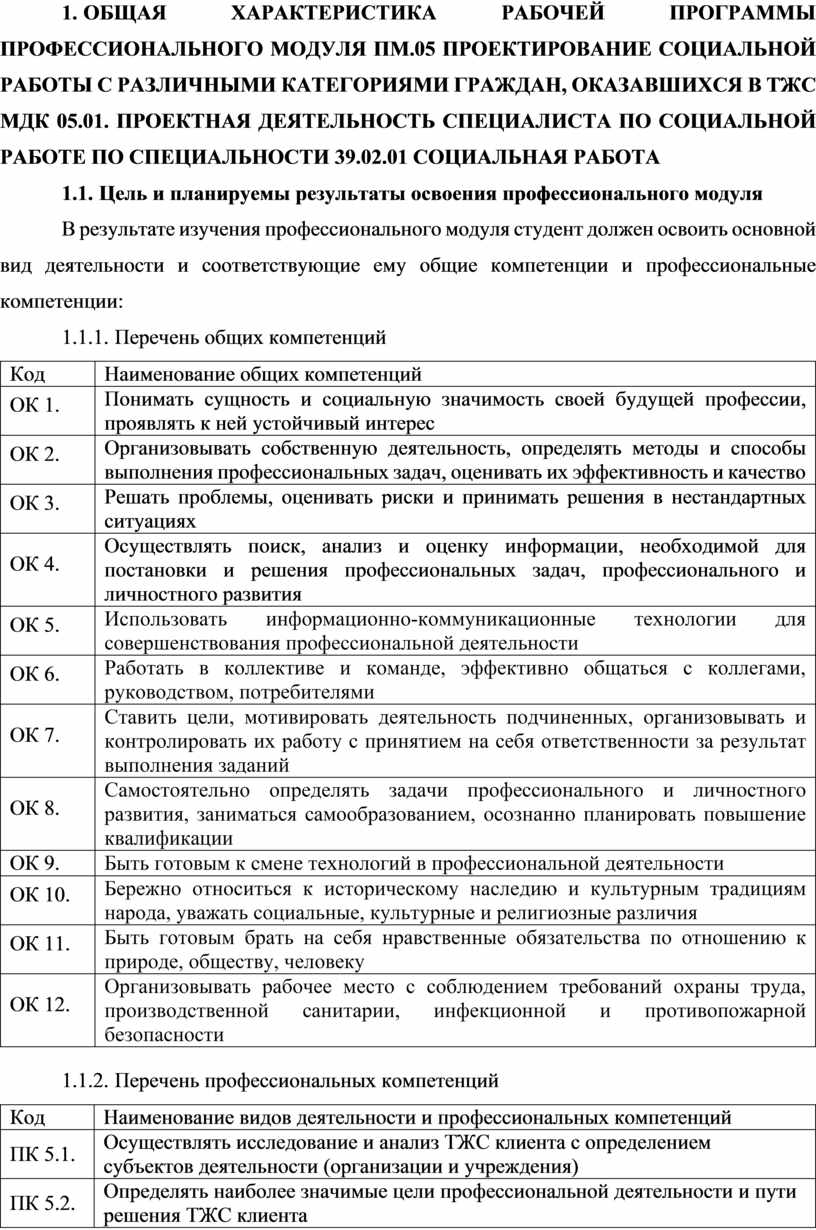 1. ОБЩАЯ ХАРАКТЕРИСТИКА РАБОЧЕЙ ПРОГРАММЫ ПРОФЕССИОНАЛЬНОГО МОДУЛЯ ПМ.05 ПРОЕКТИРОВАНИЕ СОЦИАЛЬНОЙ РАБОТЫ С РАЗЛИЧНЫМИ КАТЕГОРИЯМИ ГРАЖДАН, ОКАЗАВШИХСЯ В ТЖС МДК 05.01. ПРОЕКТНАЯ ДЕЯТЕЛЬНОСТЬ СПЕЦИАЛИСТА ПО СОЦИАЛЬНОЙ РАБОТЕ ПО СПЕЦИАЛЬНОСТИ 39.02.01 СОЦИАЛЬНАЯ РАБОТА |