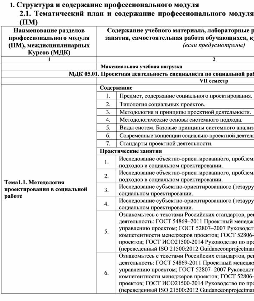 2. СТРУКТУРА И СОДЕРЖАНИЕ ПРОФЕССИОНАЛЬНОГО МОДУЛЯ ПМ.05 ПРОЕКТИРОВАНИЕ СОЦИАЛЬНОЙ РАБОТЫ С РАЗЛИЧНЫМИ КАТЕГОРИЯМИ ГРАЖДАН, ОКАЗАВШИХСЯ В ТЖС МДК 05.01. ПРОЕКТНАЯ ДЕЯТЕЛЬНОСТЬ СПЕЦИАЛИСТА ПО СОЦИАЛЬНОЙ РАБОТЕ ПО СПЕЦИАЛЬНОСТИ 39.02.01 СОЦИАЛЬНАЯ РАБОТА