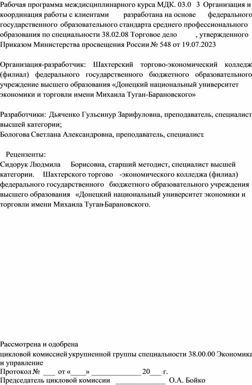 Рабочая программа междисциплинарного курса МДК. 03.03 Организация и координация работы с клиентами разработана на основе федерального государственного образовательного стандарта среднего профессионального образования по специальности 38.02.08 Торговое дело, утвержденного Приказом Министерства просвещения России № 548 от 19.07.2023