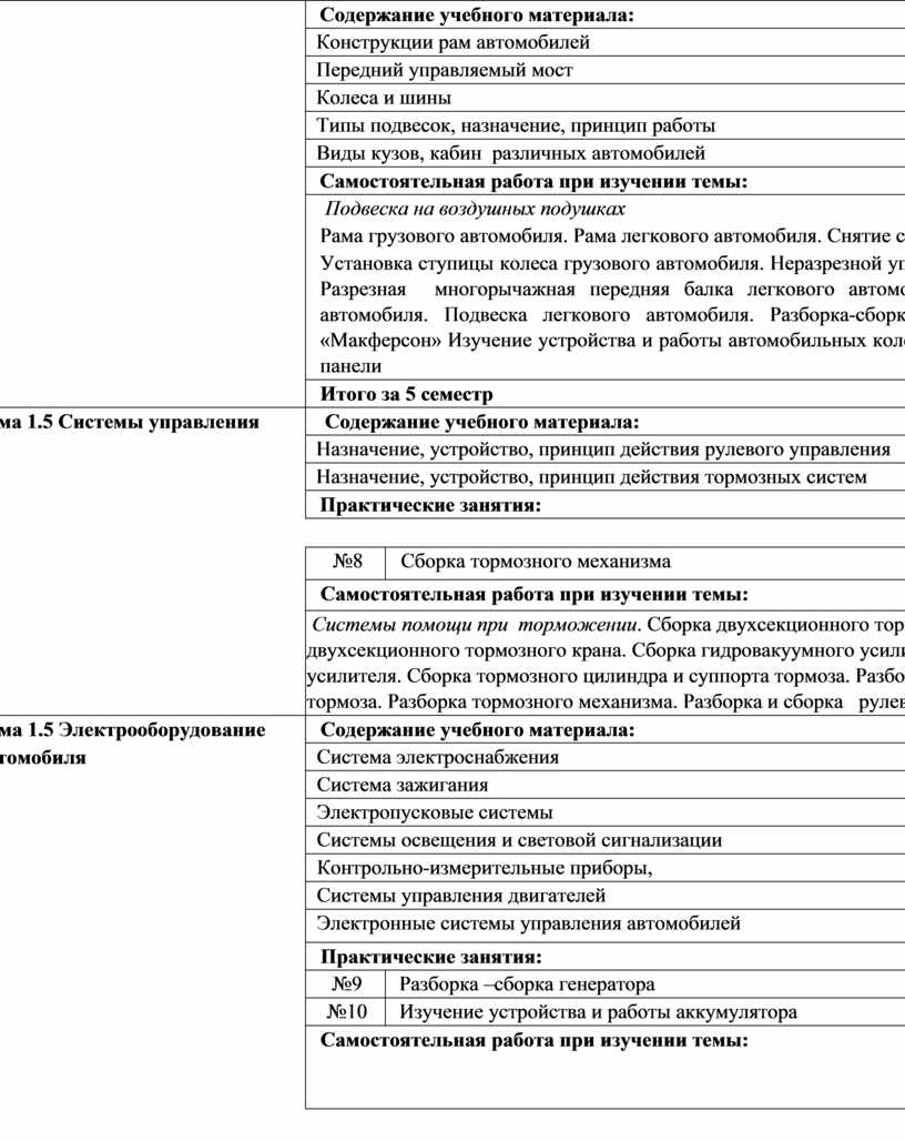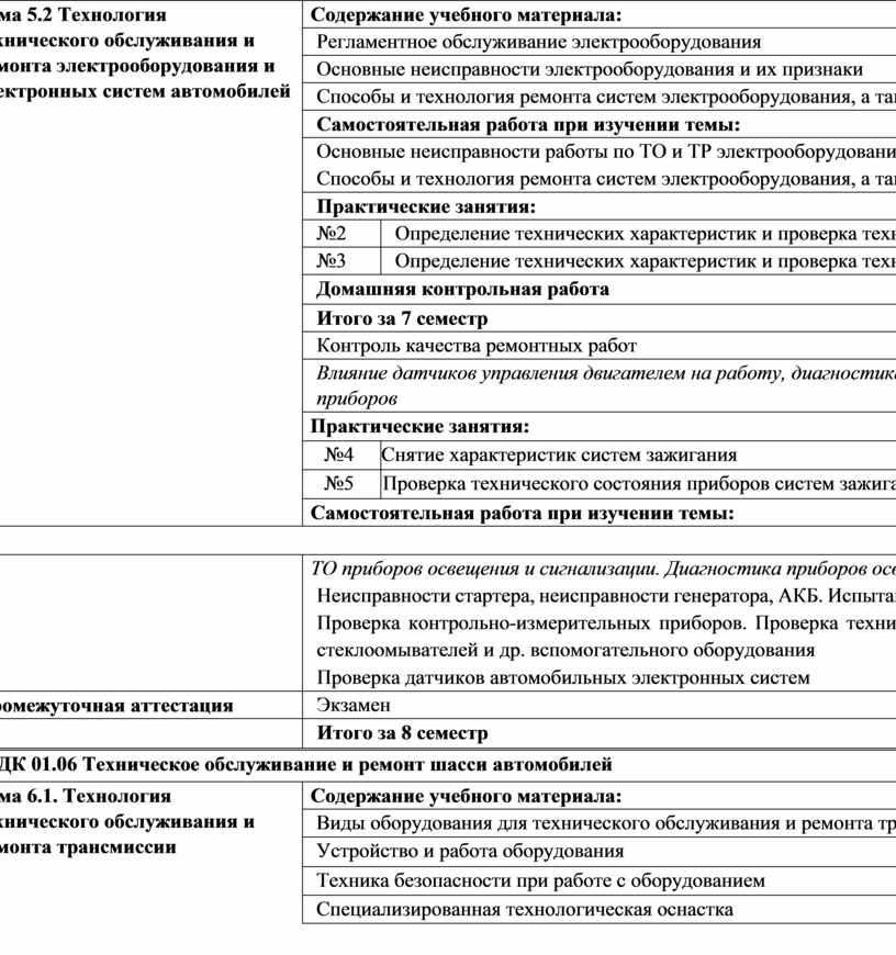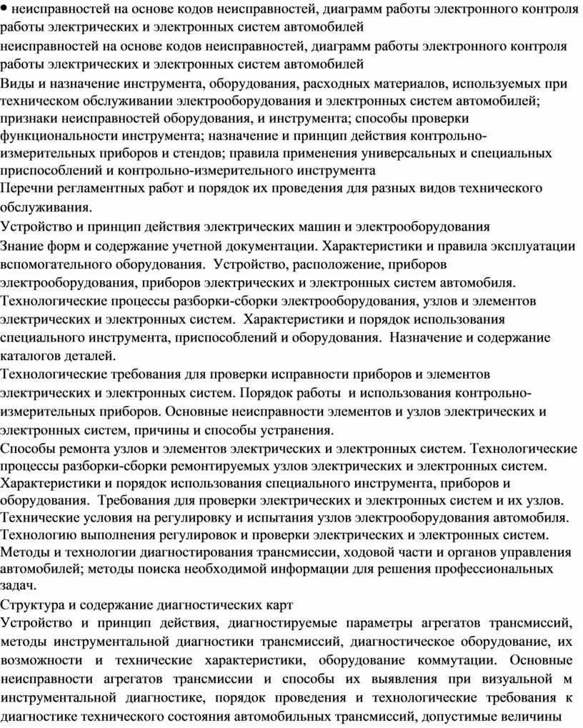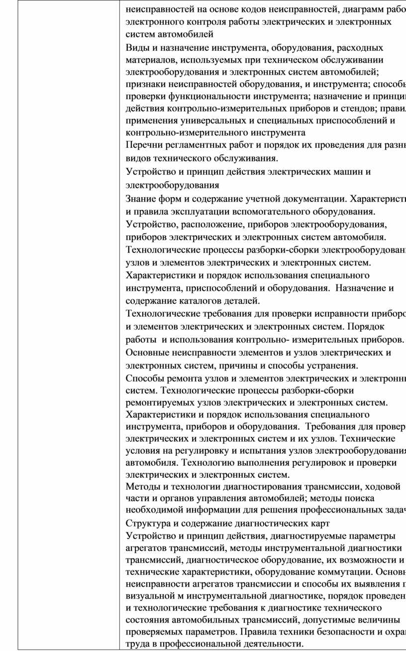 неисправностей на основе кодов неисправностей, диаграмм работы электронного контроля работы электрических и электронных систем автомобилей Виды и назначение инструмента, оборудования, расходных материалов, используемых при техническом обслуживании электрооборудования и электронных систем автомобилей; признаки неисправностей оборудования, и инструмента; способы проверки функциональности инструмента; назначение и принцип действия контрольно-измерительных приборов и стендов; правила применения универсальных и специальных приспособлений и контрольно-измерительного инструмента Перечни регламентных работ и порядок их проведения для разных видов технического обслуживания. Устройство и принцип действия электрических машин и электрооборудования Знание форм и содержание учетной документации. Характеристики и правила эксплуатации вспомогательного оборудования. Устройство, расположение, приборов электрооборудования, приборов электрических и электронных систем автомобиля. Технологические процессы разборки-сборки электрооборудования, узлов и элементов электрических и электронных систем. Характеристики и порядок использования специального инструмента, приспособлений и оборудования. Назначение и содержание каталогов деталей. Технологические требования для проверки исправности приборов и элементов электрических и электронных систем. Порядок работы и использования контрольно- измерительных приборов. Основные неисправности элементов и узлов электрических и электронных систем, причины и способы устранения. Способы ремонта узлов и элементов электрических и электронных систем. Технологические процессы разборки-сборки ремонтируемых узлов электрических и электронных систем. Характеристики и порядок использования специального инструмента, приборов и оборудования. Требования для проверки электрических и электронных систем и их узлов. Технические условия на регулировку и испытания узлов электрооборудования автомобиля. Технологию выполнения регулировок и проверки электрических и электронных систем. Методы и технологии диагностирования трансмиссии, ходовой части и органов управления автомобилей; методы поиска необходимой информации для решения профессиональных задач. Структура и содержание диагностических карт Устройство и принцип действия, диагностируемые параметры агрегатов трансмиссий, методы инструментальной диагностики трансмиссий, диагностическое оборудование, их возможности и технические характеристики, оборудование коммутации. Основные неисправности агрегатов трансмиссии и способы их выявления при визуальной м инструментальной диагностике, порядок проведения и технологические требования к диагностике технического состояния автомобильных трансмиссий, допустимые величины проверяемых параметров. Правила техники безопасности и охраны труда в профессиональной деятельности. Устройство, работа, регулировки, технические параметры исправного состояния ходовой части и механизмов управления |