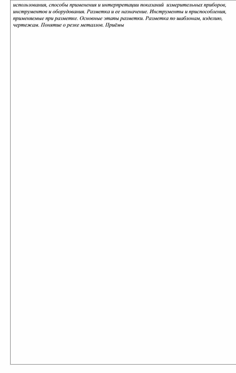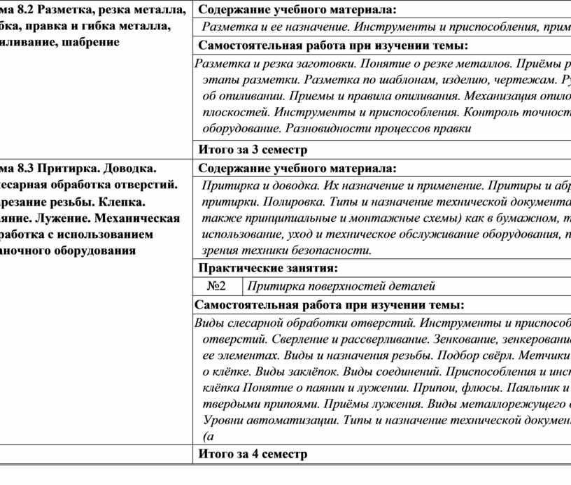 металла. Инструменты и оборудование. Разновидности процессов правки. Понятие об опиливании. Приемы и правила опиливания. Механизация опиловочных работ. Шабрение различных плоскостей. Инструменты и приспособления. Контроль точности шабрения. Притирка и доводка. Их назначение и применение. Притиры и абразивные материалы. Меха-низация притирки. Полировка. Типы и назначение технической документации, включая руководства и рисунки (а также принципиальные и монтажные схемы) как в бумажном, так и электронном виде. Назначение, использование, уход и техническое обслуживание оборудования, последствия их применения с точки зрения техники безопасности. Виды слесарной обработки отверстий. Инструменты и приспособления, применяемые при обработке отверстий. Сверление и рассверливание. Зенкование, зенкерование, развертывание. Понятие о резьбе и ее элементах. Виды и назначения резьбы. Подбор свёрл. Метчики и плашки. Понятие о клёпке. Виды заклёпок. Виды соединений. Приспособления и инструменты. Ручная и механическая клёпка. Понятие о паянии и лужении. Припои, флюсы. Паяльник и паяльные лампы. Паяние мягкими и твердыми припоями. Приёмы лужения. Виды металлорежущего оборудования. Маркировка станков. Уровни автоматизации. Типы и назначение технической документации, включая руководства и рисунки (а также принципиальные и монтажные схемы) как в бумажном, так и электронном виде. Назначение, использование, уход и техническое обслуживание оборудования, последствия их применения с точки зрения техники безопасности |