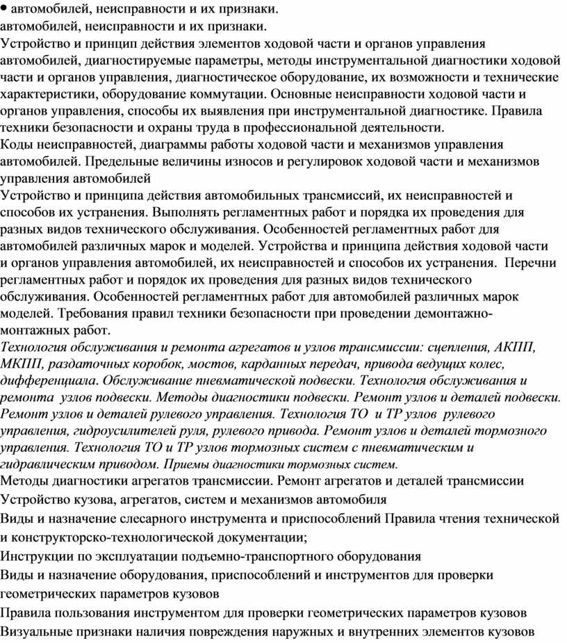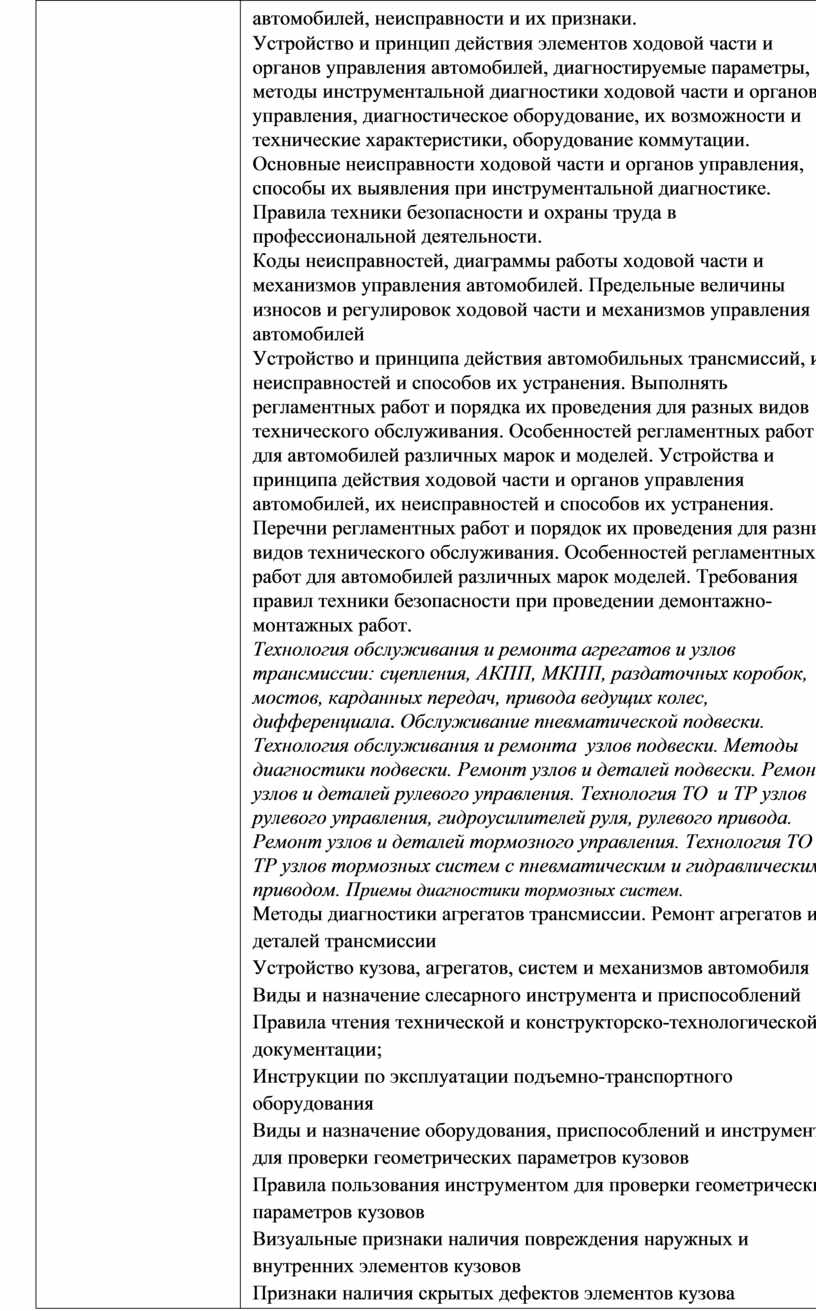 автомобилей, неисправности и их признаки. Устройство и принцип действия элементов ходовой части и органов управления автомобилей, диагностируемые параметры, методы инструментальной диагностики ходовой части и органов управления, диагностическое оборудование, их возможности и технические характеристики, оборудование коммутации. Основные неисправности ходовой части и органов управления, способы их выявления при инструментальной диагностике. Правила техники безопасности и охраны труда в профессиональной деятельности. Коды неисправностей, диаграммы работы ходовой части и механизмов управления автомобилей. Предельные величины износов и регулировок ходовой части и механизмов управления автомобилей Устройство и принципа действия автомобильных трансмиссий, их неисправностей и способов их устранения. Выполнять регламентных работ и порядка их проведения для разных видов технического обслуживания. Особенностей регламентных работ для автомобилей различных марок и моделей. Устройства и принципа действия ходовой части и органов управления автомобилей, их неисправностей и способов их устранения. Перечни регламентных работ и порядок их проведения для разных видов технического обслуживания. Особенностей регламентных работ для автомобилей различных марок моделей. Требования правил техники безопасности при проведении демонтажно-монтажных работ. Технология обслуживания и ремонта агрегатов и узлов трансмиссии: сцепления, АКПП, МКПП, раздаточных коробок, мостов, карданных передач, привода ведущих колес, дифференциала. Обслуживание пневматической подвески. Технология обслуживания и ремонта узлов подвески. Методы диагностики подвески. Ремонт узлов и деталей подвески. Ремонт узлов и деталей рулевого управления. Технология ТО и ТР узлов рулевого управления, гидроусилителей руля, рулевого привода. Ремонт узлов и деталей тормозного управления. Технология ТО и ТР узлов тормозных систем с пневматическим и гидравлическим приводом. Приемы диагностики тормозных систем. Методы диагностики агрегатов трансмиссии. Ремонт агрегатов и деталей трансмиссии Устройство кузова, агрегатов, систем и механизмов автомобиля Виды и назначение слесарного инструмента и приспособлений Правила чтения технической и конструкторско-технологической документации; Инструкции по эксплуатации подъемно-транспортного оборудования Виды и назначение оборудования, приспособлений и инструментов для проверки геометрических параметров кузовов Правила пользования инструментом для проверки геометрических параметров кузовов Визуальные признаки наличия повреждения наружных и внутренних элементов кузовов Признаки наличия скрытых дефектов элементов кузова Виды чертежей и схем элементов кузовов Чтение чертежей и схем элементов кузовов |