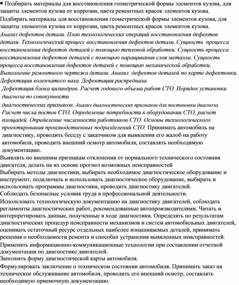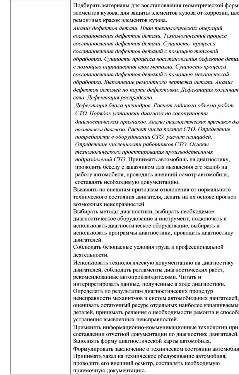 Подбирать материалы для восстановления геометрической формы элементов кузова, для защиты элементов кузова от коррозии, цвета ремонтных красок элементов кузова. Анализ дефектов детали. План технологических операций восстановления дефектов детали. Технологический процесс восстановления дефектов детали. Сущность процесса восстановления дефектов деталей с помощью тепловой обработки. Сущность процесса восстановления дефектов деталей с помощью наращивания слоя металла. Сущность процесса восстановления дефектов деталей с помощью механической обработки. Выполнение ремонтного чертежа детали. Анализ дефектов деталей по карте дефектовки. Дефектация коленчатого вала. Дефектация распредвала. Дефектация блока цилиндров. Расчет годового объема работ СТО. Порядок установки диагноза по совокупности диагностических признаков. Анализ диагностических признаков для постановки диагноза. Расчет числа постов СТО. Определение потребности в оборудовании СТО, расчет площадей. Определение численности работников СТО. Основы технологического проектирования производственных подразделений СТО. Принимать автомобиль на диагностику, проводить беседу с заказчиком для выявления его жалоб на работу автомобиля, проводить внешний осмотр автомобиля, составлять необходимую документацию. Выявлять по внешним признакам отклонения от нормального технического состояния двигателя, делать на их основе прогноз возможных неисправностей Выбирать методы диагностики, выбирать необходимое диагностическое оборудование и инструмент, подключать и использовать диагностическое оборудование, выбирать и использовать программы диагностики, проводить диагностику двигателей. Соблюдать безопасные условия труда в профессиональной деятельности. Использовать технологическую документацию на диагностику двигателей, соблюдать регламенты диагностических работ, рекомендованные автопроизводителями. Читать и интерпретировать данные, полученные в ходе диагностики. Определять по результатам диагностических процедур неисправности механизмов и систем автомобильных двигателей, оценивать остаточный ресурс отдельных наиболее изнашиваемых деталей, принимать решения о необходимости ремонта и способах устранения выявленных неисправностей. Применять информационно-коммуникационные технологии при составлении отчетной документации по диагностике двигателей. Заполнять форму диагностической карты автомобиля. Формулировать заключение о техническом состоянии автомобиля. Принимать заказ на техническое обслуживание автомобиля, проводить его внешний осмотр, составлять необходимую приемочную документацию. Определять перечень регламентных работ по техническому обслуживанию двигателя. Выбирать необходимое оборудование для проведения работ по техническому обслуживанию автомобилей, определять исправность и функциональность |