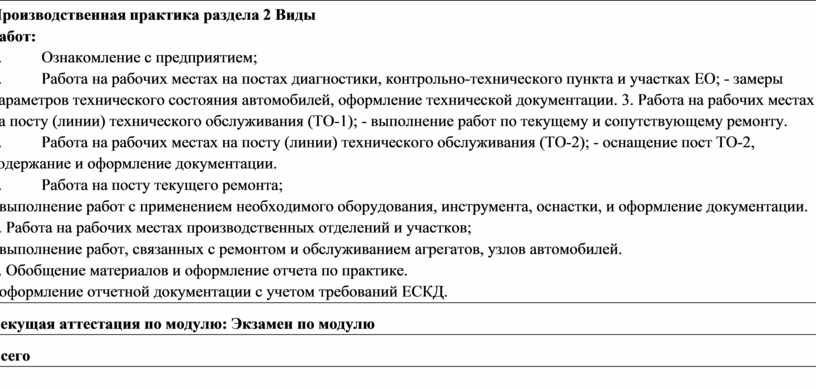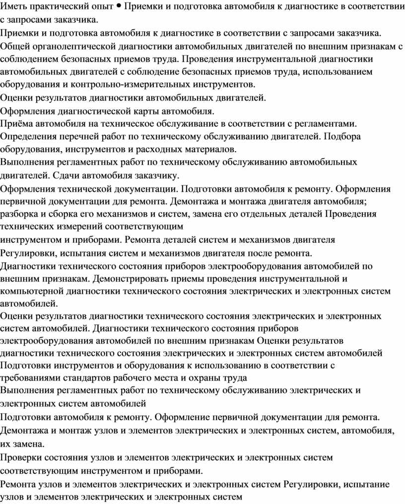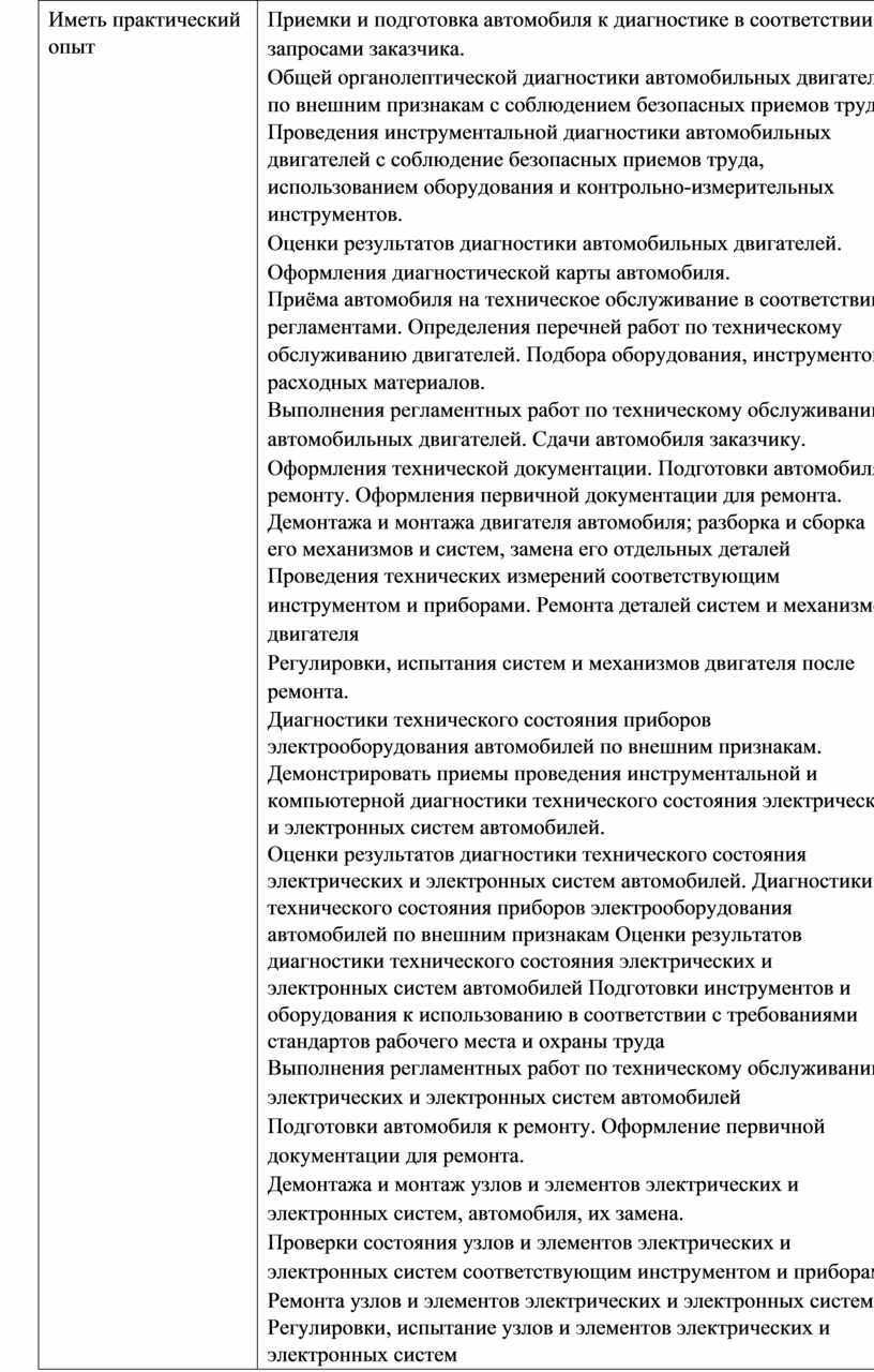 Приемки и подготовка автомобиля к диагностике в соответствии с запросами заказчика. Общей органолептической диагностики автомобильных двигателей по внешним признакам с соблюдением безопасных приемов труда. Проведения инструментальной диагностики автомобильных двигателей с соблюдение безопасных приемов труда, использованием оборудования и контрольно-измерительных инструментов. Оценки результатов диагностики автомобильных двигателей. Оформления диагностической карты автомобиля. Приёма автомобиля на техническое обслуживание в соответствии с регламентами. Определения перечней работ по техническому обслуживанию двигателей. Подбора оборудования, инструментов и расходных материалов. Выполнения регламентных работ по техническому обслуживанию автомобильных двигателей. Сдачи автомобиля заказчику. Оформления технической документации. Подготовки автомобиля к ремонту. Оформления первичной документации для ремонта. Демонтажа и монтажа двигателя автомобиля; разборка и сборка его механизмов и систем, замена его отдельных деталей Проведения технических измерений соответствующим инструментом и приборами. Ремонта деталей систем и механизмов двигателя Регулировки, испытания систем и механизмов двигателя после ремонта. Диагностики технического состояния приборов электрооборудования автомобилей по внешним признакам. Демонстрировать приемы проведения инструментальной и компьютерной диагностики технического состояния электрических и электронных систем автомобилей. Оценки результатов диагностики технического состояния электрических и электронных систем автомобилей. Диагностики технического состояния приборов электрооборудования автомобилей по внешним признакам Оценки результатов диагностики технического состояния электрических и электронных систем автомобилей Подготовки инструментов и оборудования к использованию в соответствии с требованиями стандартов рабочего места и охраны труда Выполнения регламентных работ по техническому обслуживанию электрических и электронных систем автомобилей Подготовки автомобиля к ремонту. Оформление первичной документации для ремонта. Демонтажа и монтаж узлов и элементов электрических и электронных систем, автомобиля, их замена. Проверки состояния узлов и элементов электрических и электронных систем соответствующим инструментом и приборами. Ремонта узлов и элементов электрических и электронных систем Регулировки, испытание узлов и элементов электрических и электронных систем Подготовки средств диагностирования трансмиссии, ходовой части и органов управления автомобилей. Диагностики технического состояния автомобильных трансмиссий по внешним признакам. Проведения инструментальной диагностики технического |