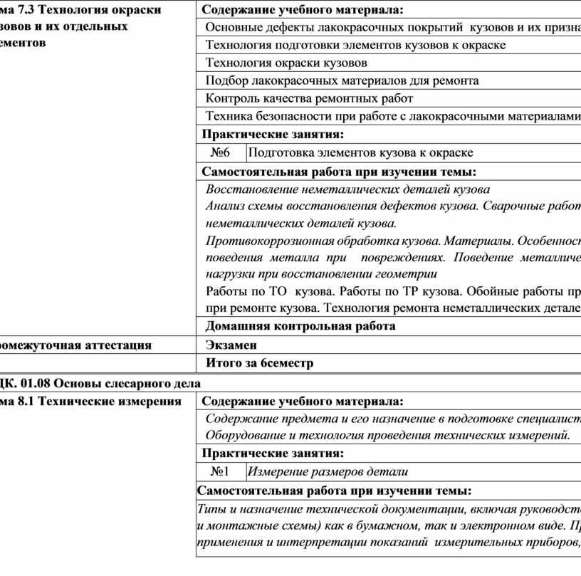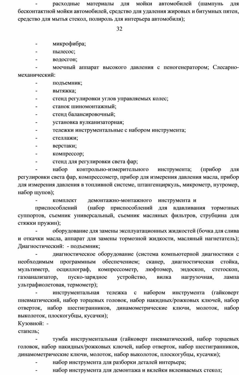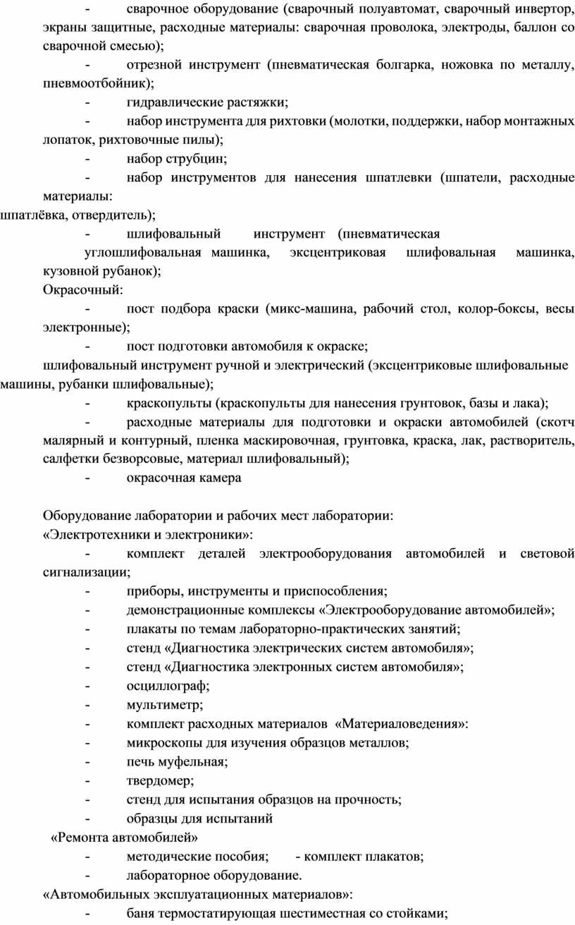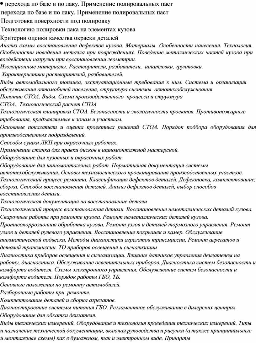 перехода по базе и по лаку. Применение полировальных паст Подготовка поверхности под полировку Технологию полировки лака на элементах кузова Критерии оценки качества окраски деталей Анализ схемы восстановления дефектов кузова. Материалы. Особенности нанесения. Технология. Особенности поведения металла при повреждениях. Поведение металлических частей кузова при воздействии нагрузки при восстановлении геометрии. Изоляционные материалы. Растворители, разбавители, шпатлевки, грунтовки. Характеристики растворителей, разбавителей. Виды автомобильного топлива, эксплуатационные требования к ним. Система и организация обслуживания автомобилей населения, структура системы автотехобслуживания Понятие СТОА. Виды. Схема производственного процесса и структура СТОА. Технологический расчет СТОА Технологическая планировка СТОА. Безопасность и экологичность проектов. Противопожарные требования, предъявляемые к зонам и участкам. Основные показатели и оценка проектных решений СТОА. Порядок подбора оборудования для производственных подразделений. Способы сушки ЛКП при окрасочных работах. Применение станка для правки дисков в шиномонтажной мастерской. Оборудование для кузовных и окрасочных работ. Оборудование для шиномонтажных работ. Нормативная документация системы автотехобслуживания. Основы технологического проектирования производственных участков. Технологический процесс ремонта. Классификация дефектов деталей. Дефектовка, комплектование, сборка. Способы восстановления деталей. Анализ дефектов деталей, выбор способов восстановления детали. Технологическая документация на восстановление детали Технологический процесс восстановления детали. Восстановление неметаллических деталей кузова. Сварочные работы при ремонте кузова. Ремонт неметаллических деталей кузова. Противокоррозионная обработка кузова. Ремонт узлов и деталей тормозного управления. Ремонт узлов и деталей рулевого управления. Восстановление покрышек и камер. Обслуживание пневматической подвески. Методы диагностики агрегатов трансмиссии. Ремонт агрегатов и деталей трансмиссии. ТО приборов освещения и сигнализации Диагностика приборов освещения и сигнализации. Влияние датчиков управления двигателем на работу, диагностика. Обслуживание осветительных приборов. Диагностика систем безопасности и комфорта водителя. Схемы электронного управления. Обслуживание систем безопасности и комфорта водителя. Порядок работы ГБО, ТБ. Основные положения по ремонту автомобилей. Разборочные работы при ремонте. Комплектование деталей и сборка агрегатов. Диагностирование системы питания ГБО. Регламентное обслуживание в дилерских центрах. Оборудование для обкатки двигателя. Виды технических измерений. Оборудование и технология проведения технических измерений. Типы и назначение технической документации, включая руководства и рисунки (а также принципиальные и монтажные схемы) как в бумажном, так и электронном виде. Принципы использования, способы применения и интерпретации показаний измерительных приборов, инструментов и оборудования. Разметка и ее назначение. Инструменты и приспособления, применяемые при разметке. Основные этапы разметки. Разметка по шаблонам, изделию, чертежам. Понятие о резке металлов. Приёмы |