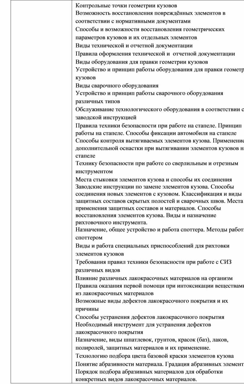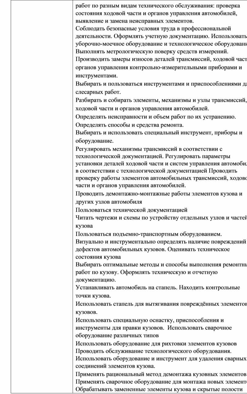 работ по разным видам технического обслуживания: проверка состояния ходовой части и органов управления автомобилей, выявление и замена неисправных элементов. Соблюдать безопасные условия труда в профессиональной деятельности. Оформлять учетную документацию. Использовать уборочно-моечное оборудование и технологическое оборудование. Выполнять метрологическую поверку средств измерений. Производить замеры износов деталей трансмиссий, ходовой части и органов управления контрольно-измерительными приборами и инструментами. Выбирать и пользоваться инструментами и приспособлениями для слесарных работ. Разбирать и собирать элементы, механизмы и узлы трансмиссий, ходовой части и органов управления автомобилей. Определять неисправности и объем работ по их устранению. Определять способы и средства ремонта. Выбирать и использовать специальный инструмент, приборы и оборудование. Регулировать механизмы трансмиссий в соответствии с технологической документацией. Регулировать параметры установки деталей ходовой части и систем управления автомобилей в соответствии с технологической документацией Проводить проверку работы элементов автомобильных трансмиссий, ходовой части и органов управления автомобилей. Проводить демонтажно-монтажные работы элементов кузова и других узлов автомобиля Пользоваться технической документацией Читать чертежи и схемы по устройству отдельных узлов и частей кузова Пользоваться подъемно-транспортным оборудованием. Визуально и инструментально определять наличие повреждений и дефектов автомобильных кузовов. Оценивать техническое состояния кузова Выбирать оптимальные методы и способы выполнения ремонтных работ по кузову. Оформлять техническую и отчетную документацию. Устанавливать автомобиль на стапель. Находить контрольные точки кузова. Использовать стапель для вытягивания повреждённых элементов кузовов. Использовать специальную оснастку, приспособления и инструменты для правки кузовов. Использовать сварочное оборудование различных типов Использовать оборудование для рихтовки элементов кузовов Проводить обслуживание технологического оборудования. Использовать оборудование и инструмент для удаления сварных соединений элементов кузова. Применять рациональный метод демонтажа кузовных элементов Применять сварочное оборудование для монтажа новых элементов. Обрабатывать замененные элементы кузова и скрытые полости защитными материалами. Восстановление плоских поверхностей элементов кузова. Восстановление ребер жесткости элементов кузова Визуально определять исправность средств индивидуальной |