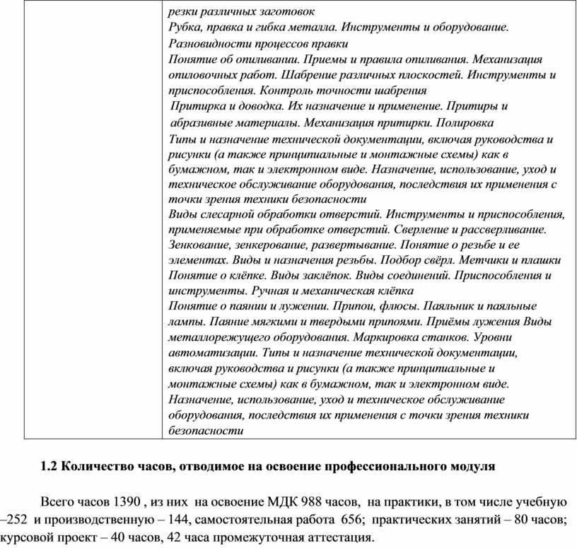 Всего часов 1390 , из них на освоение МДК 988 часов, на практики, в том числе учебную –252 и производственную – 144, самостоятельная работа 656; практических занятий – 80 часов; курсовой проект – 40 часов, 42 часа промежуточная аттестация.