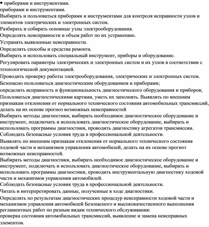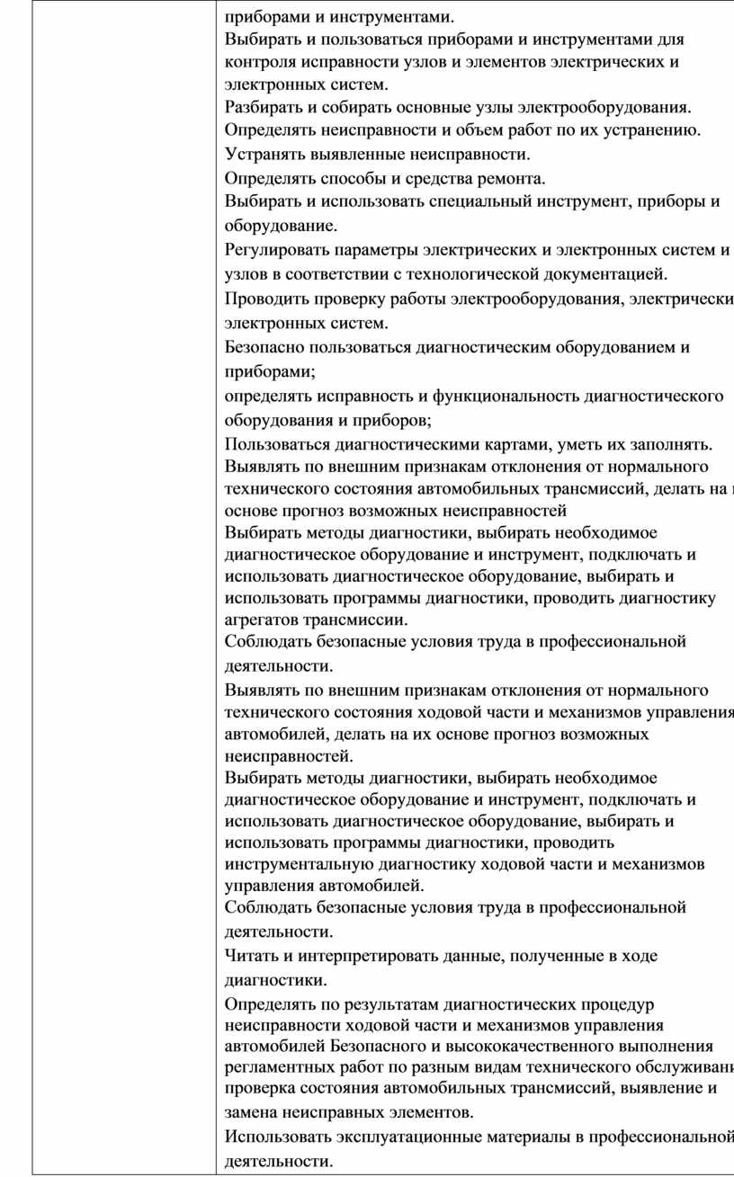 приборами и инструментами. Выбирать и пользоваться приборами и инструментами для контроля исправности узлов и элементов электрических и электронных систем. Разбирать и собирать основные узлы электрооборудования. Определять неисправности и объем работ по их устранению. Устранять выявленные неисправности. Определять способы и средства ремонта. Выбирать и использовать специальный инструмент, приборы и оборудование. Регулировать параметры электрических и электронных систем и их узлов в соответствии с технологической документацией. Проводить проверку работы электрооборудования, электрических и электронных систем. Безопасно пользоваться диагностическим оборудованием и приборами; определять исправность и функциональность диагностического оборудования и приборов; Пользоваться диагностическими картами, уметь их заполнять. Выявлять по внешним признакам отклонения от нормального технического состояния автомобильных трансмиссий, делать на их основе прогноз возможных неисправностей Выбирать методы диагностики, выбирать необходимое диагностическое оборудование и инструмент, подключать и использовать диагностическое оборудование, выбирать и использовать программы диагностики, проводить диагностику агрегатов трансмиссии. Соблюдать безопасные условия труда в профессиональной деятельности. Выявлять по внешним признакам отклонения от нормального технического состояния ходовой части и механизмов управления автомобилей, делать на их основе прогноз возможных неисправностей. Выбирать методы диагностики, выбирать необходимое диагностическое оборудование и инструмент, подключать и использовать диагностическое оборудование, выбирать и использовать программы диагностики, проводить инструментальную диагностику ходовой части и механизмов управления автомобилей. Соблюдать безопасные условия труда в профессиональной деятельности. Читать и интерпретировать данные, полученные в ходе диагностики. Определять по результатам диагностических процедур неисправности ходовой части и механизмов управления автомобилей Безопасного и высококачественного выполнения регламентных работ по разным видам технического обслуживания: проверка состояния автомобильных трансмиссий, выявление и замена неисправных элементов. Использовать эксплуатационные материалы в профессиональной деятельности. Выбирать материалы на основе анализа их свойств, для конкретного применения. Безопасного и высококачественного выполнения регламентных |
