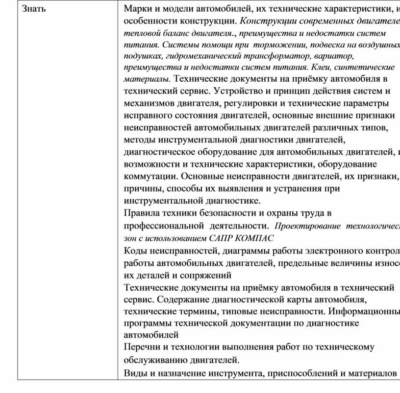 Марки и модели автомобилей, их технические характеристики, и особенности конструкции. Конструкции современных двигателей, тепловой баланс двигателя., преимущества и недостатки систем питания. Системы помощи при торможении, подвеска на воздушных подушках, гидромеханический трансформатор, вариатор, преимущества и недостатки систем питания. Клеи, синтетические материалы. Технические документы на приёмку автомобиля в технический сервис. Устройство и принцип действия систем и механизмов двигателя, регулировки и технические параметры исправного состояния двигателей, основные внешние признаки неисправностей автомобильных двигателей различных типов, методы инструментальной диагностики двигателей, диагностическое оборудование для автомобильных двигателей, их возможности и технические характеристики, оборудование коммутации. Основные неисправности двигателей, их признаки, причины, способы их выявления и устранения при инструментальной диагностике. Правила техники безопасности и охраны труда в профессиональной деятельности. Проектирование технологических зон с использованием САПР КОМПАС Коды неисправностей, диаграммы работы электронного контроля работы автомобильных двигателей, предельные величины износов их деталей и сопряжений Технические документы на приёмку автомобиля в технический сервис. Содержание диагностической карты автомобиля, технические термины, типовые неисправности. Информационные программы технической документации по диагностике автомобилей Перечни и технологии выполнения работ по техническому обслуживанию двигателей. Виды и назначение инструмента, приспособлений и материалов |