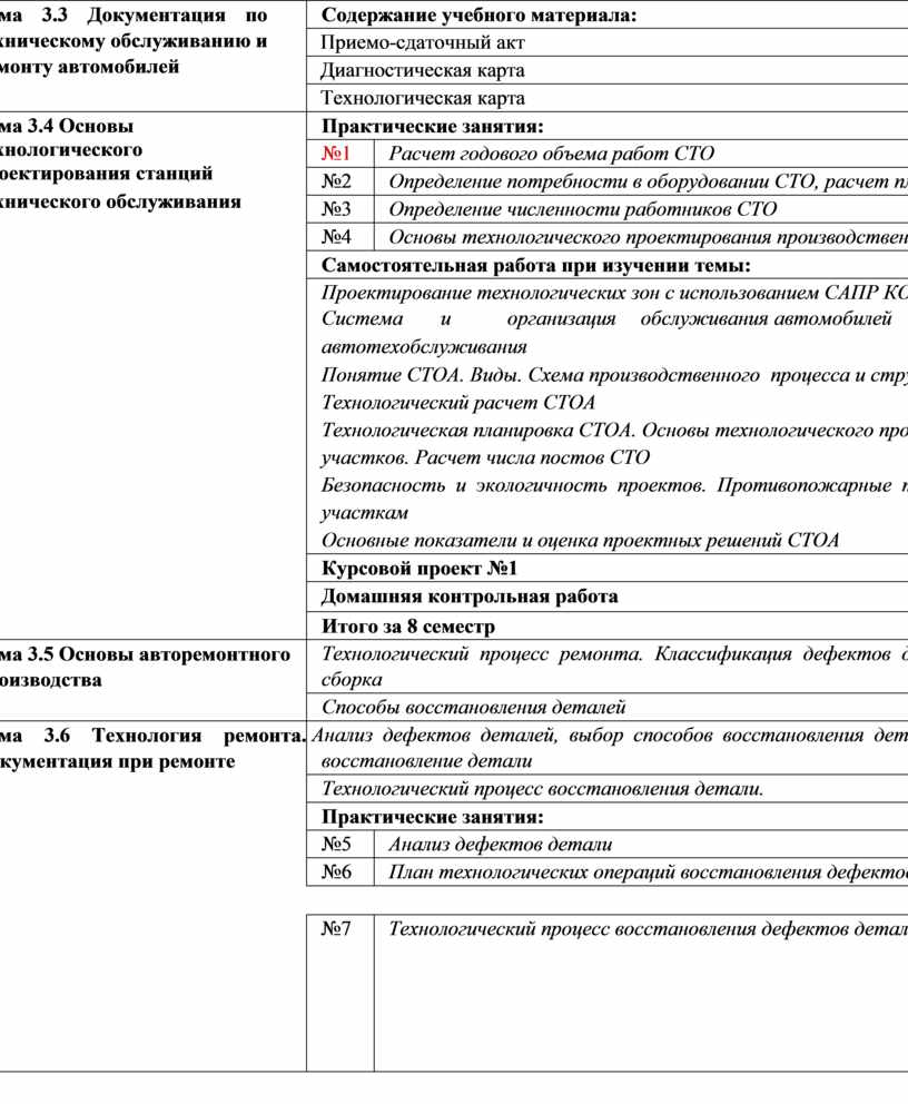 Принимать заказ на техническое обслуживание автомобиля, проводить его внешний осмотр, составлять необходимую приемочную документацию. Определять перечень регламентных работ по техническому обслуживанию двигателя. Выбирать необходимое оборудование для проведения работ по техническому обслуживанию автомобилей, определять исправность и функциональность инструментов, оборудования; определять тип и количество необходимых эксплуатационных материалов для технического обслуживания двигателя в соответствии с технической документацией подбирать материалы требуемого качества в соответствии с технической документацией Выполнять регламентные работы по разным видам технического обслуживания в соответствии с регламентом автопроизводителя: замена технических жидкостей, замена деталей и расходных материалов, проведение необходимых регулировок и др. Использовать эксплуатационные материалы в профессиональной деятельности. Определять основные свойства материалов по маркам. Выбирать материалы на основе анализа их свойств, для конкретного применения. Составлять отчетную документацию по проведению технического обслуживания автомобилей с применением информационно-коммуникационные технологий. Заполнять форму наряда на проведение технического обслуживания автомобиля. Заполнять сервисную книжку. Отчитываться перед заказчиком о выполненной работе. Виды автомобильного топлива, эксплуатационные требования к ним Система и организация обслуживания автомобилей населения, структура системы автотехобслуживания Понятие СТОА. Виды. Схема производственного процесса и структура СТО. Технологический расчет СТОА Технологическая планировка СТОА. Основы технологического проектирования производственных участков Безопасность и экологичность проектов. Противопожарные требования, предъявляемые к зонам и участкам Основные показатели и оценка проектных решений СТОА Расчет годового объема работ СТО Расчет числа постов СТО Определение потребности в оборудовании СТО, расчет площадей Определение численности работников СТО Основы технологического проектирования производственных подразделений СТО. Проектирование технологических зон с использованием САПР КОМПАС. Оборудование для обкатки двигателя. Опасные факторы при работе оборудования Регламентное обслуживание в дилерских центрах. Анализ диагностических признаков для постановки диагноза. |