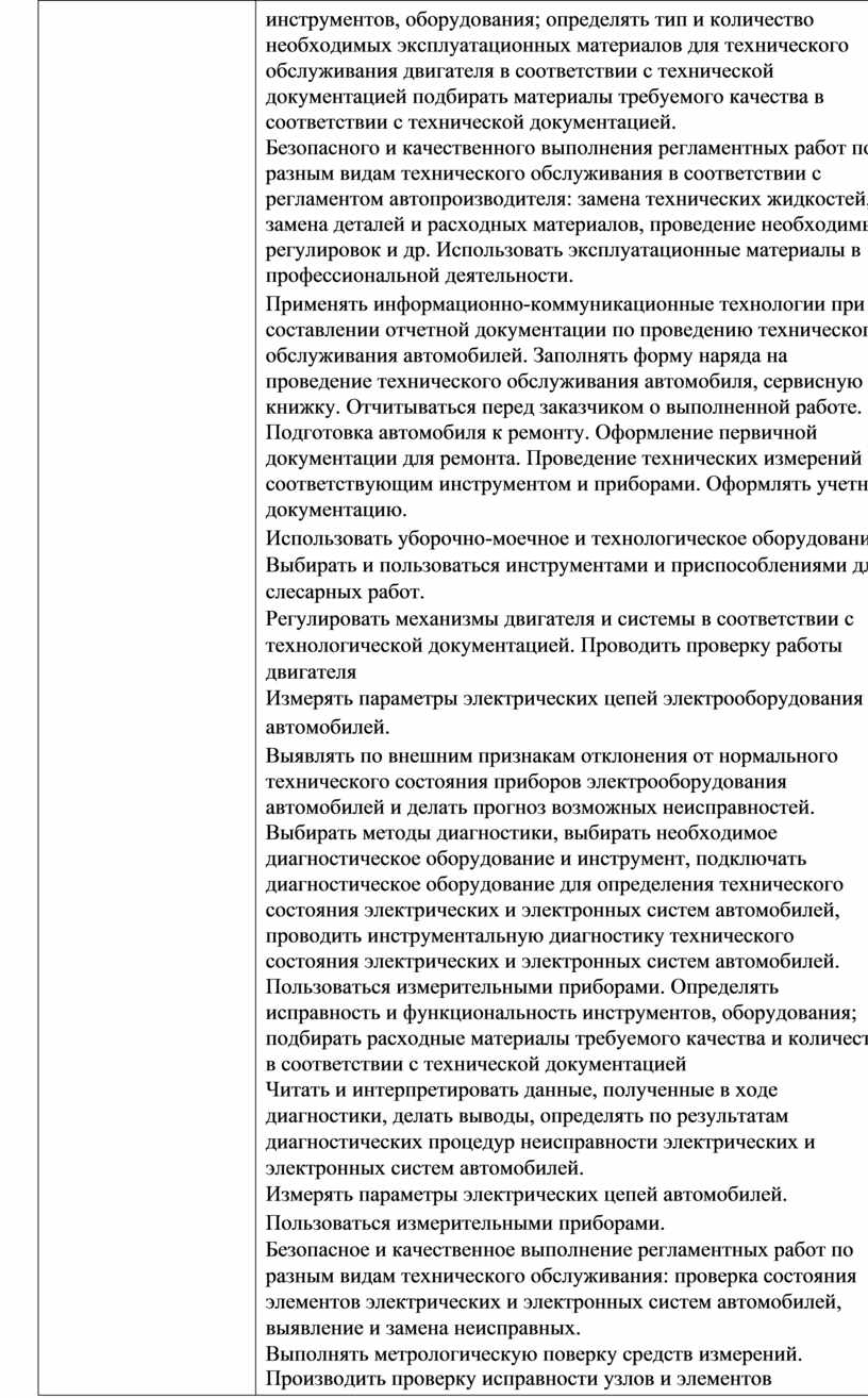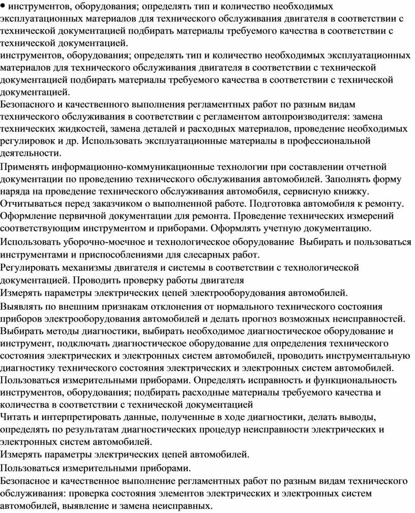 инструментов, оборудования; определять тип и количество необходимых эксплуатационных материалов для технического обслуживания двигателя в соответствии с технической документацией подбирать материалы требуемого качества в соответствии с технической документацией. Безопасного и качественного выполнения регламентных работ по разным видам технического обслуживания в соответствии с регламентом автопроизводителя: замена технических жидкостей, замена деталей и расходных материалов, проведение необходимых регулировок и др. Использовать эксплуатационные материалы в профессиональной деятельности. Применять информационно-коммуникационные технологии при составлении отчетной документации по проведению технического обслуживания автомобилей. Заполнять форму наряда на проведение технического обслуживания автомобиля, сервисную книжку. Отчитываться перед заказчиком о выполненной работе. Подготовка автомобиля к ремонту. Оформление первичной документации для ремонта. Проведение технических измерений соответствующим инструментом и приборами. Оформлять учетную документацию. Использовать уборочно-моечное и технологическое оборудование Выбирать и пользоваться инструментами и приспособлениями для слесарных работ. Регулировать механизмы двигателя и системы в соответствии с технологической документацией. Проводить проверку работы двигателя Измерять параметры электрических цепей электрооборудования автомобилей. Выявлять по внешним признакам отклонения от нормального технического состояния приборов электрооборудования автомобилей и делать прогноз возможных неисправностей. Выбирать методы диагностики, выбирать необходимое диагностическое оборудование и инструмент, подключать диагностическое оборудование для определения технического состояния электрических и электронных систем автомобилей, проводить инструментальную диагностику технического состояния электрических и электронных систем автомобилей. Пользоваться измерительными приборами. Определять исправность и функциональность инструментов, оборудования; подбирать расходные материалы требуемого качества и количества в соответствии с технической документацией Читать и интерпретировать данные, полученные в ходе диагностики, делать выводы, определять по результатам диагностических процедур неисправности электрических и электронных систем автомобилей. Измерять параметры электрических цепей автомобилей. Пользоваться измерительными приборами. Безопасное и качественное выполнение регламентных работ по разным видам технического обслуживания: проверка состояния элементов электрических и электронных систем автомобилей, выявление и замена неисправных. Выполнять метрологическую поверку средств измерений. Производить проверку исправности узлов и элементов электрических и электронных систем контрольно-измерительными |