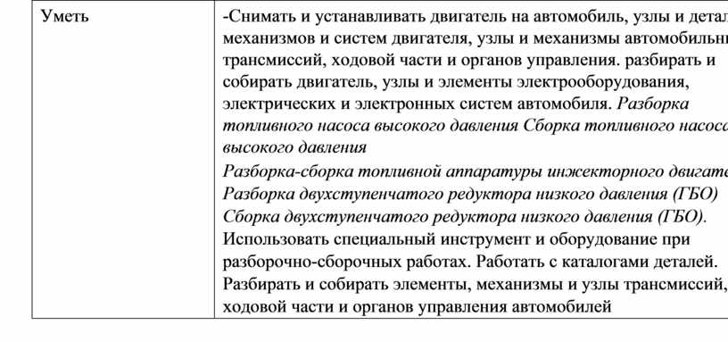 -Снимать и устанавливать двигатель на автомобиль, узлы и детали механизмов и систем двигателя, узлы и механизмы автомобильных трансмиссий, ходовой части и органов управления. разбирать и собирать двигатель, узлы и элементы электрооборудования, электрических и электронных систем автомобиля. Разборка топливного насоса высокого давления Сборка топливного насоса высокого давления Разборка-сборка топливной аппаратуры инжекторного двигателя Разборка двухступенчатого редуктора низкого давления (ГБО) Сборка двухступенчатого редуктора низкого давления (ГБО). Использовать специальный инструмент и оборудование при разборочно-сборочных работах. Работать с каталогами деталей. Разбирать и собирать элементы, механизмы и узлы трансмиссий, ходовой части и органов управления автомобилей |