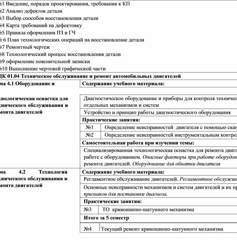 Оформлять учетную документацию. Использовать уборочно-моечное и технологическое оборудование Снимать и устанавливать двигатель на автомобиль, разбирать и собирать двигатель. Использовать специальный инструмент и оборудование при разборочно-сборочных работах. Работать с каталогами деталей. Выполнять метрологическую поверку средств измерений. Производить замеры деталей и параметров двигателя контрольно-измерительными приборами и инструментами. Выбирать и пользоваться инструментами и приспособлениями для слесарных работ. Снимать и устанавливать узлы и детали механизмов и систем двигателя. Определять неисправности и объем работ по их устранению. Определять способы и средства ремонта. Выбирать и использовать специальный инструмент, приборы и оборудование. Определять основные свойства материалов по маркам. Выбирать материалы на основе анализа их свойств для конкретного применения. Соблюдать безопасные условия труда в профессиональной деятельности. Регулировать механизмы двигателя и системы в соответствии с технологической документацией. Проводить проверку работы двигателя. Разборка топливного насоса высокого давления Сборка топливного насоса высокого давления Разборка-сборка топливной аппаратуры инжекторного двигателя Разборка двухступенчатого редуктора низкого давления (ГБО) Сборка двухступенчатого редуктора низкого давления (ГБО) Технологический процесс ремонта. Классификация дефектов деталей. Дефектовка, комплектование, сборка Способы восстановления деталей Анализ дефектов деталей, выбор способов восстановления детали. Технологическая документация на восстановление детали. Технологический процесс восстановления детали. Анализ дефектов детали. План технологических операций восстановления дефектов детали Технологический процесс восстановления дефектов детали Сущность процесса восстановления дефектов деталей с помощью тепловой обработки, наращивания слоя металла, механической обработкой Выполнение ремонтного чертежа детали, анализ дефектов деталей по карте дефектовки. Диагностирование системы питания ГБО. Дефектация коленчатого вала Дефектация распредвала. Дефектация блока цилиндров. Содержание предмета и его назначение в подготовке специалистов. Виды технических измерений. Оборудование и технология проведения технических измерений. Типы и назначение технической документации, включая руководства и рисунки (а также принципиальные и монтажные схемы) как в бумажном, так и электронном виде. Принципы использования, способы применения и интерпретации показаний измерительных приборов, инструментов и оборудования. Измерение размеров детали. Разметка и ее назначение. Инструменты и приспособления, применяемые при разметке. Основные этапы разметки. Разметка по шаблонам, изделию, чертежам. Понятие о резке металлов. Приёмы резки различных заготовок. Разметка и резка заготовки. Рубка, правка и гибка |